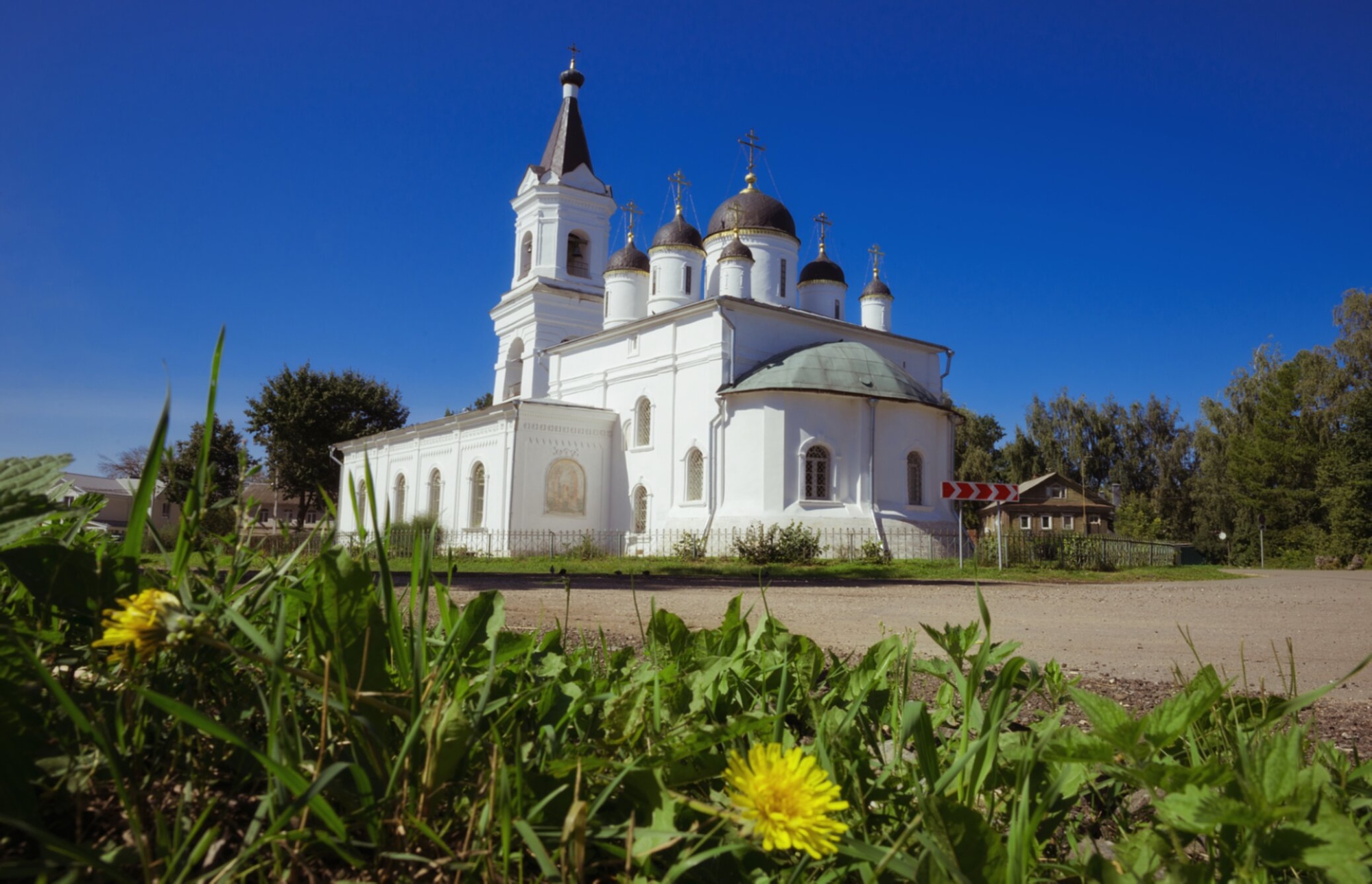 Снимок передаёт благолепие и величие святой обители. На переднем плане видны свежие зелёные заросли травы с скромными желтыми цветками одуванчика, символизирующими смирение и бренность земной жизни. Архитектурный ансамбль храма, возвышающийся на фоне ясного голубого неба, олицетворяет собой устремлённость человеческой души к горнему миру. Лаконичные формы и строгие линии собора свидетельствуют о древности его постройки.