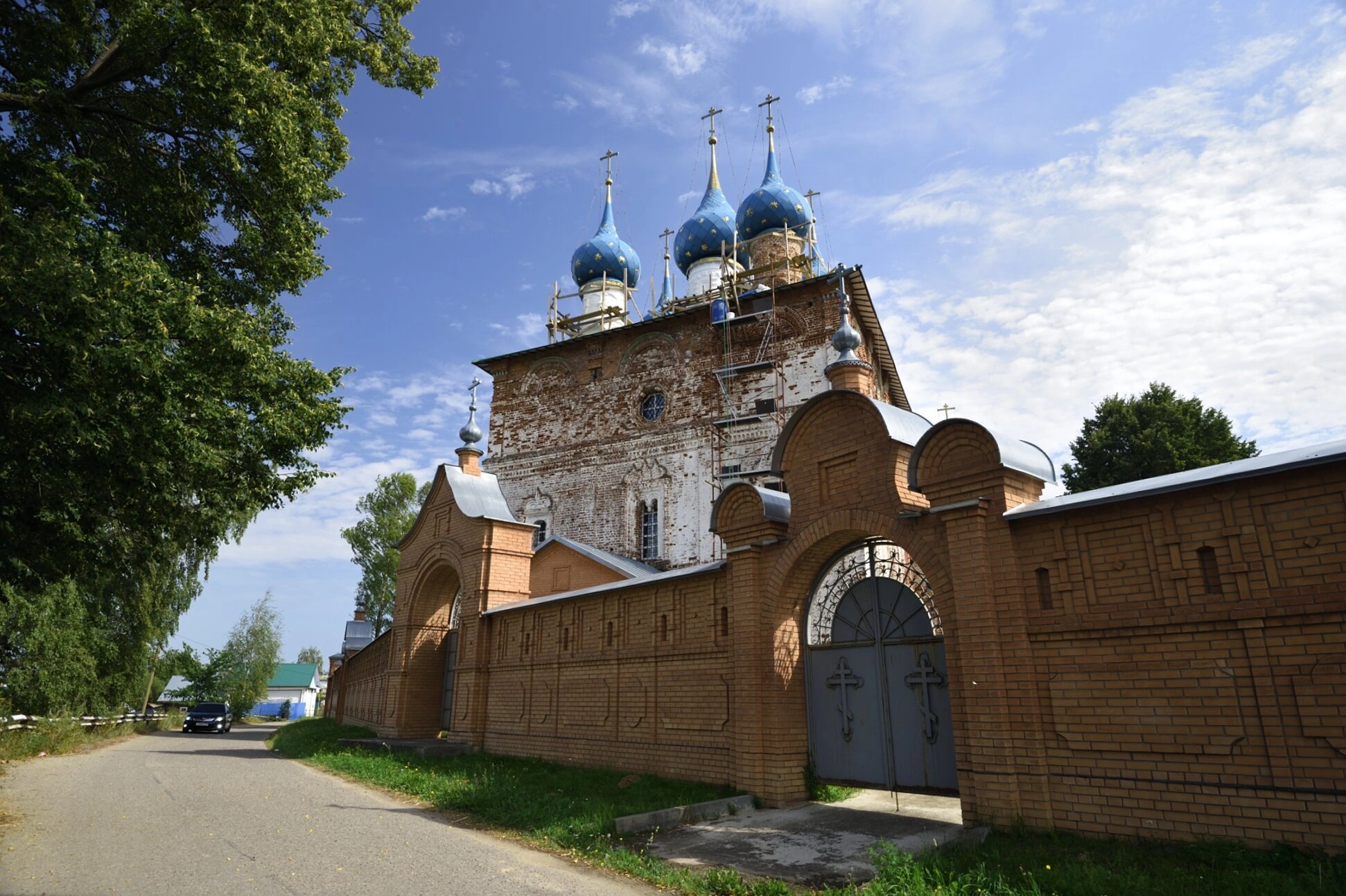 Перед собором располагается кирпичная ограда с арочными Святыми воротами, ведущими на территорию храма. Окружающий пейзаж с высокими деревьями и сельскими постройками создаёт гармоничный образ православной Руси. Важным свидетельством заботы о сохранении наследия являются видимые на фотографии реставрационные леса, указывающие на проводимые работы по восстановлению святыни.