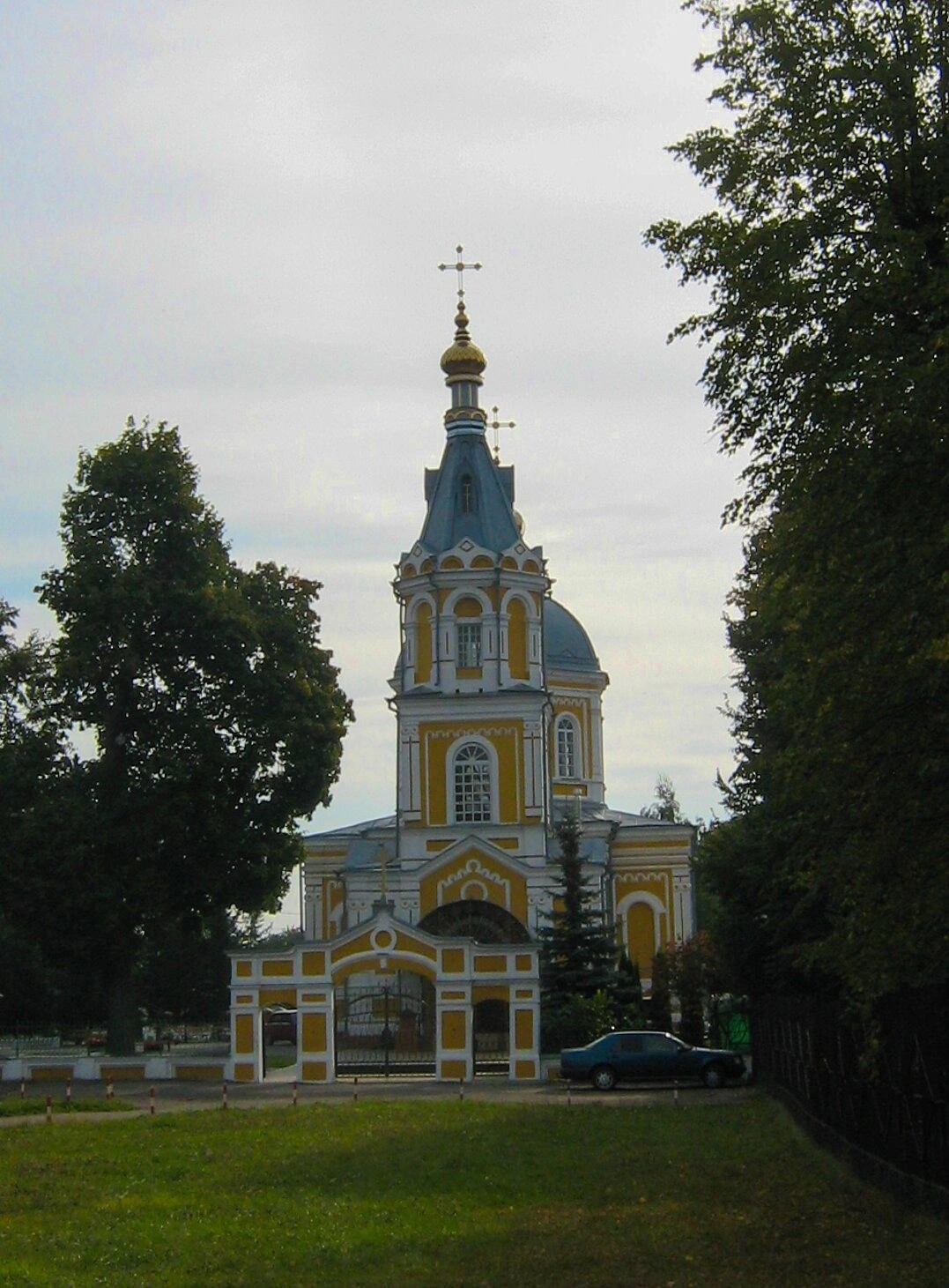 Храм окружает ухоженная территория: по бокам видны кроны взрослых деревьев, а на переднем плане расстилается зелёный травяной газон. К главному входу ведёт аккуратная дорожка, ограждённая металлической оградой с ажурными воротами. Присутствие на снимке припаркованного автомобиля подчёркивает, что храм является действующим и доступен для всех верующих.