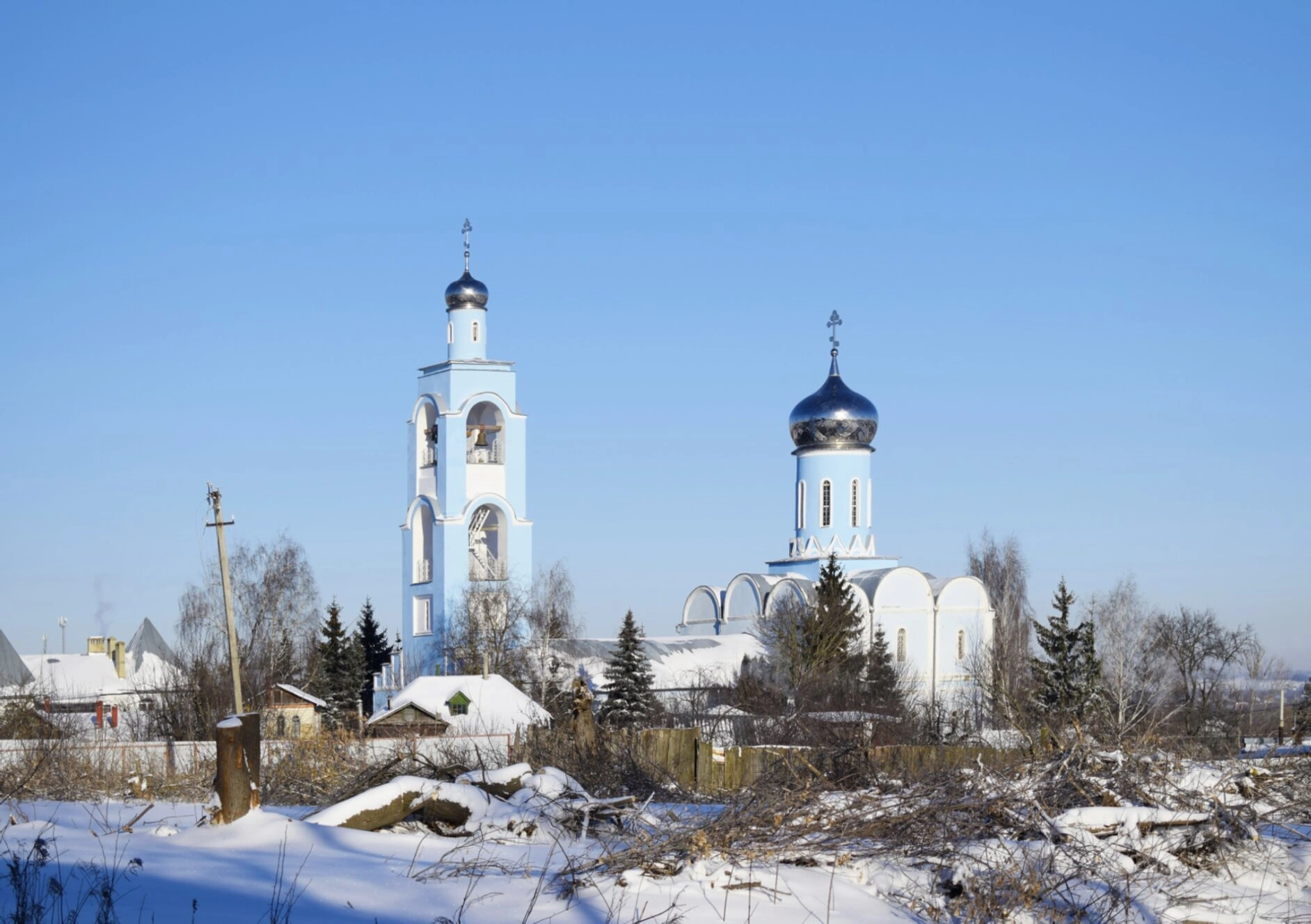 Архитектура храма исполнена в лучших традициях русского церковного зодчества. Ансамбль состоит из основного объёма, увенчанного несколькими главами, и высокой многоярусной колокольни, которая устремляется в небо. Звон её колоколов разносится далеко по округе, созывая православных на молитву. В зимний период, изображённый на снимке, собор приобретает особую тишину и величие, напоминая о вечных ценностях и божественной благодати.