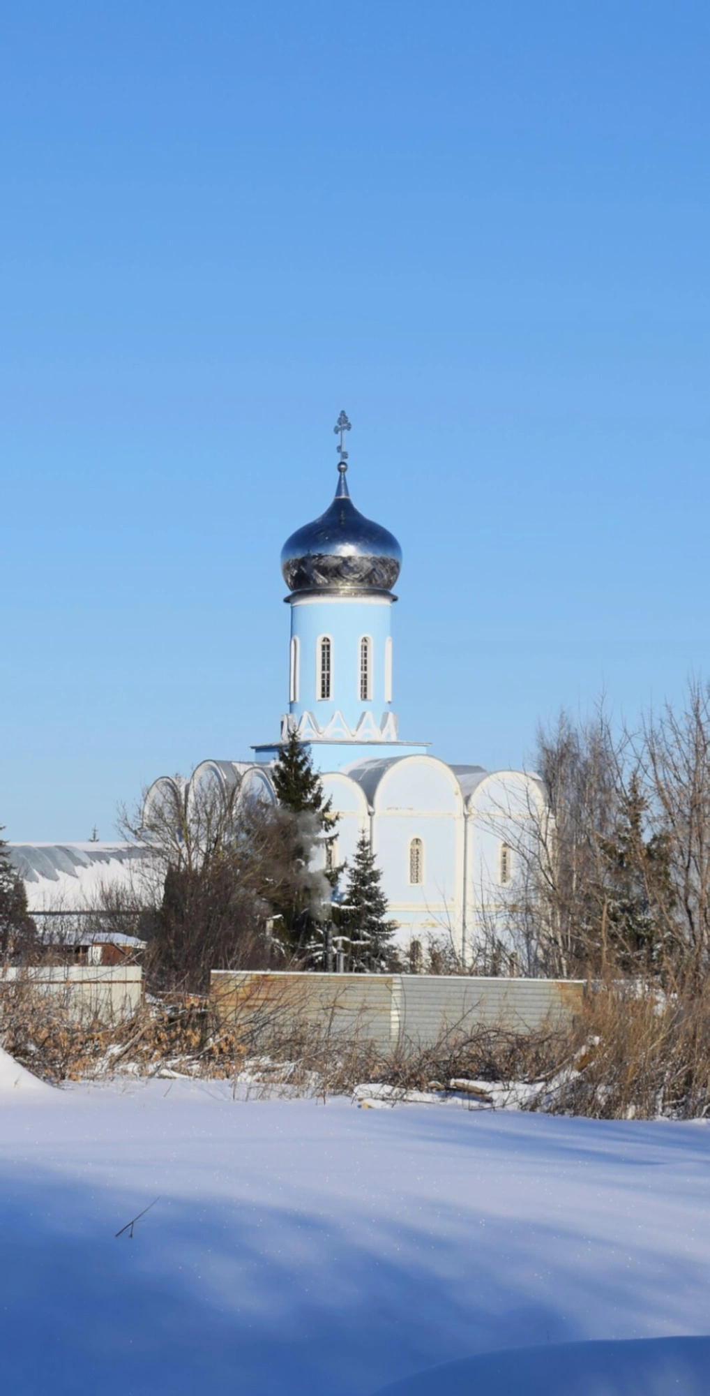 Храмовой комплекс демонстрирует величественное здание с лазурными стенами, увенчанное серебристым куполом, который символизирует небесную чистоту и духовное горение. В морозный ясный день купол храма сияет под лучами зимнего солнца, создавая возвышенный образ православной святыни.