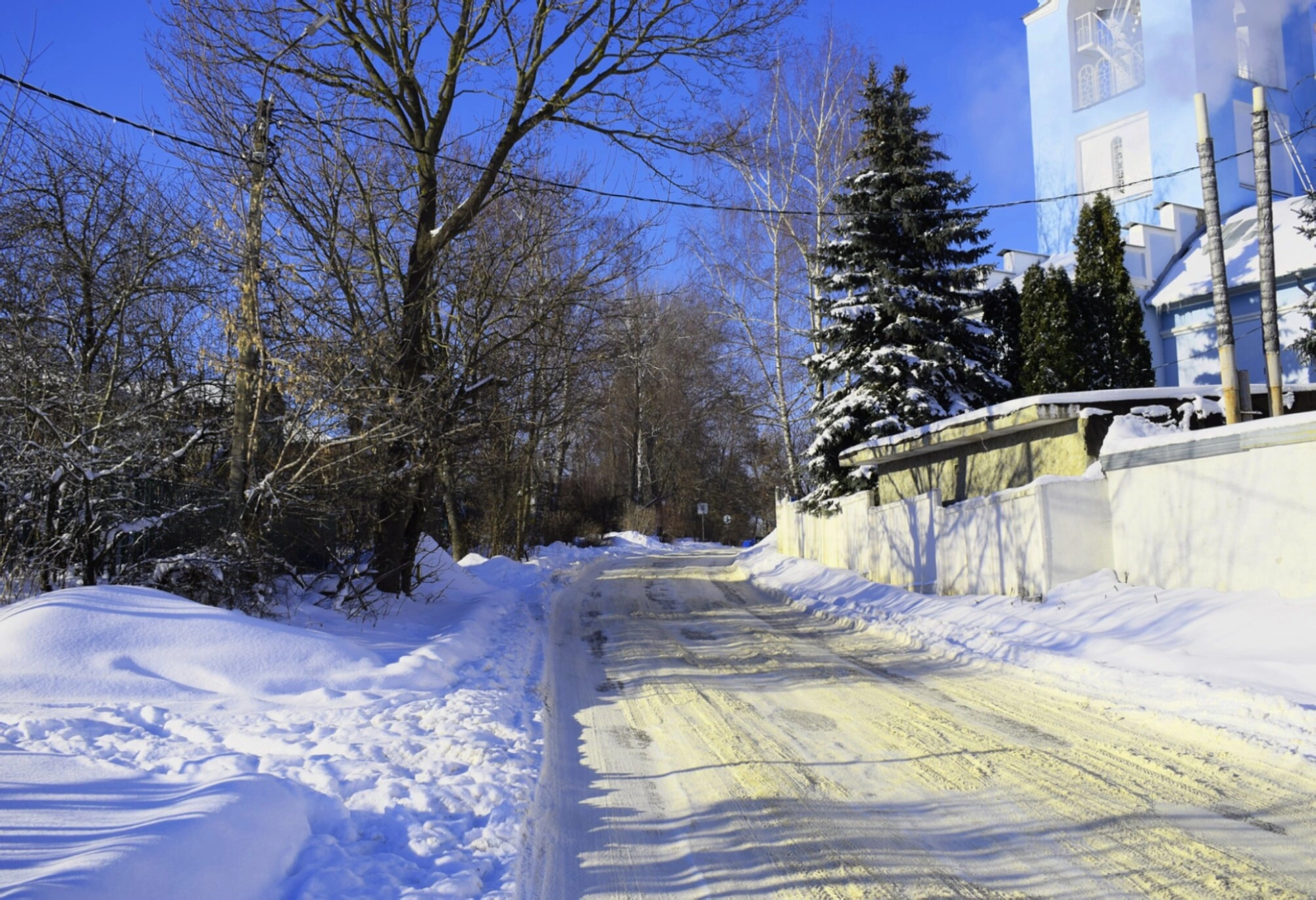 На фотографии запечатлён зимний вид, открывающийся на Собор иконы Божией Матери «Взыскание погибших», расположенный в городе Ефремове Тульской области. Заснеженная дорога ведёт взгляд к величественному храму, который является духовным центром города и выдающимся памятником церковной архитектуры.