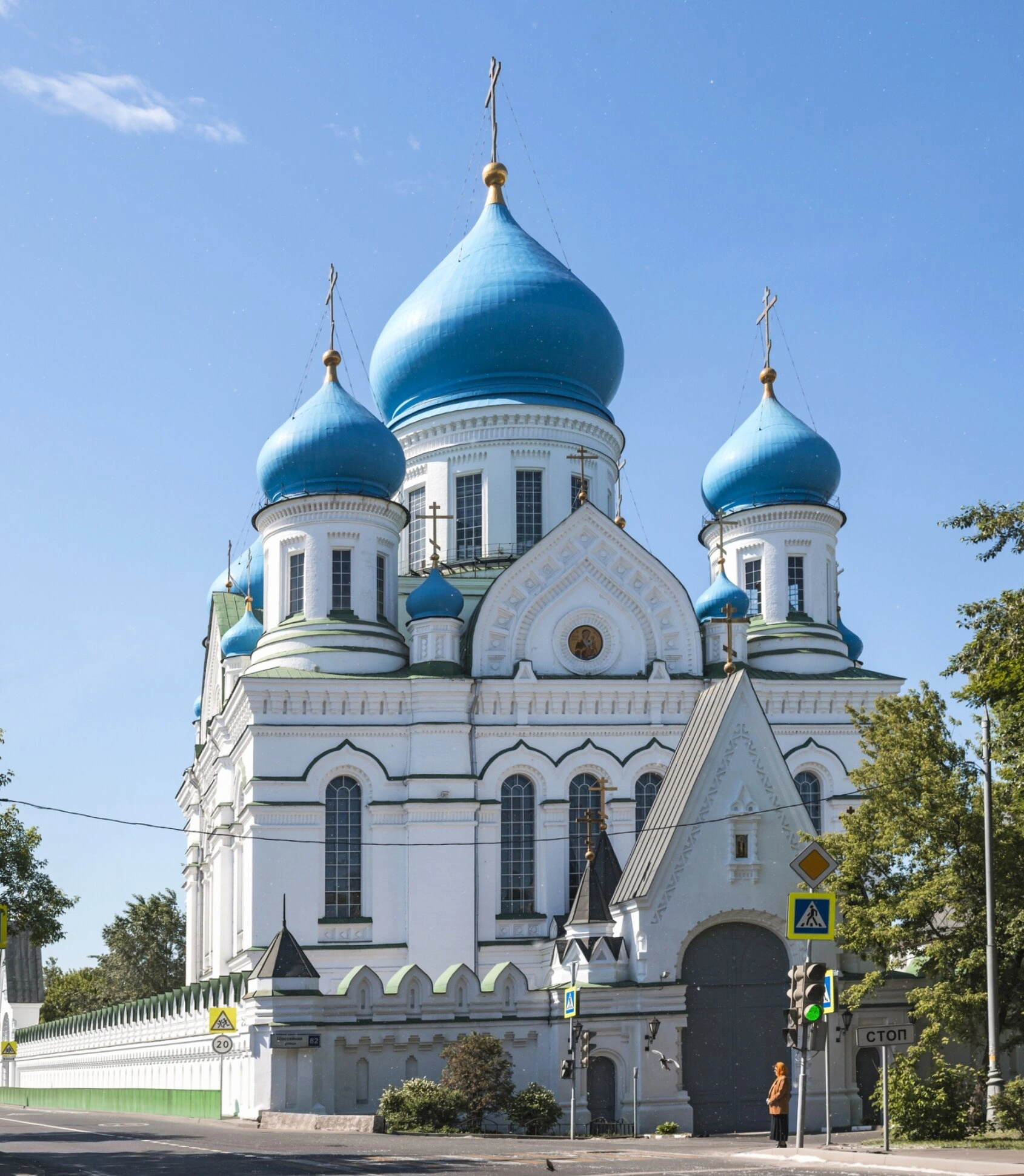 На представленной фотографии запечатлён величественный собор в честь Иверской иконы Божией Матери, являющийся частью ансамбля старинного Николо-Перервинского монастыря в Москве. Этот монументальный пятиглавый храм, возведённый в начале XX века, вмещает до трёх тысяч молящихся и является одним из последних крупных церковных сооружений, построенных в Российской империи перед эпохой гонений.