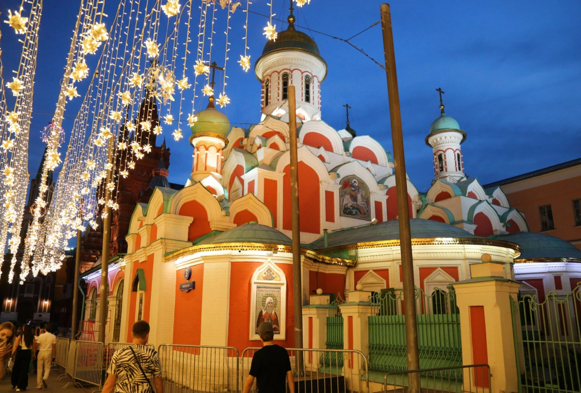 На представленной фотографии запечатлён воссозданный собор Казанской иконы Божией Матери, что на Красной площади в Москве. Этот православный храм, стоящий на углу Красной площади и Никольской улицы, является не только архитектурной доминантой, но и живым памятником русской воинской славы и духовного мужества. Он был первоначально возведён в 1625 году по обету и на средства князя Дмитрия Михайловича Пожарского в благодарность Пресвятой Богородице за победу народного ополчения над польско-литовскими интервентами в 1612 году. Для новопостроенного храма князь Пожарский принёс из Введенской церкви на Лубянке главную святыню ополчения — чудотворный список Казанской иконы Божией Матери, который и дал название собору.