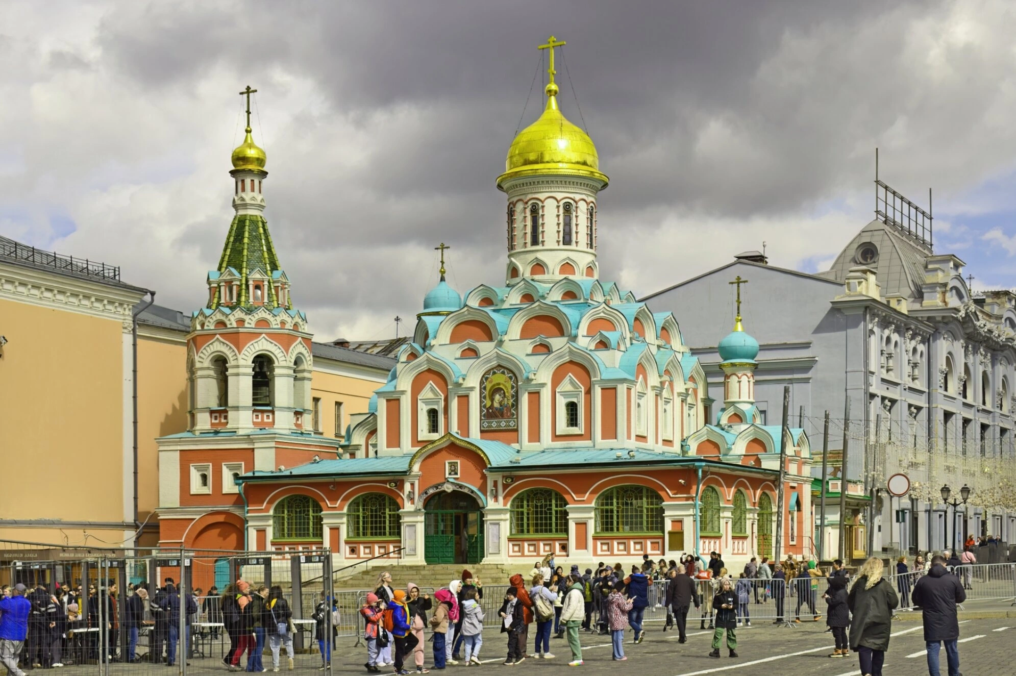 Главной святыней собора издревле является чудотворный список Казанской иконы Божией Матери — той самой, перед которой молилось ополчение Минина и Пожарского. В дни празднования обретения иконы и освобождения Москвы к храму совершались многолюдные крестные ходы. На снимке видно, что у стен святыни и на прилегающей площади находится множество людей, что свидетельствует о неизменном почитании этого места как верующими, так и гостями города. Пасмурное небо на фото не скрывает яркого и праздничного облика этого воинского памятника в камне, возрождённого из небытия как символ торжества православной веры и народной памяти.