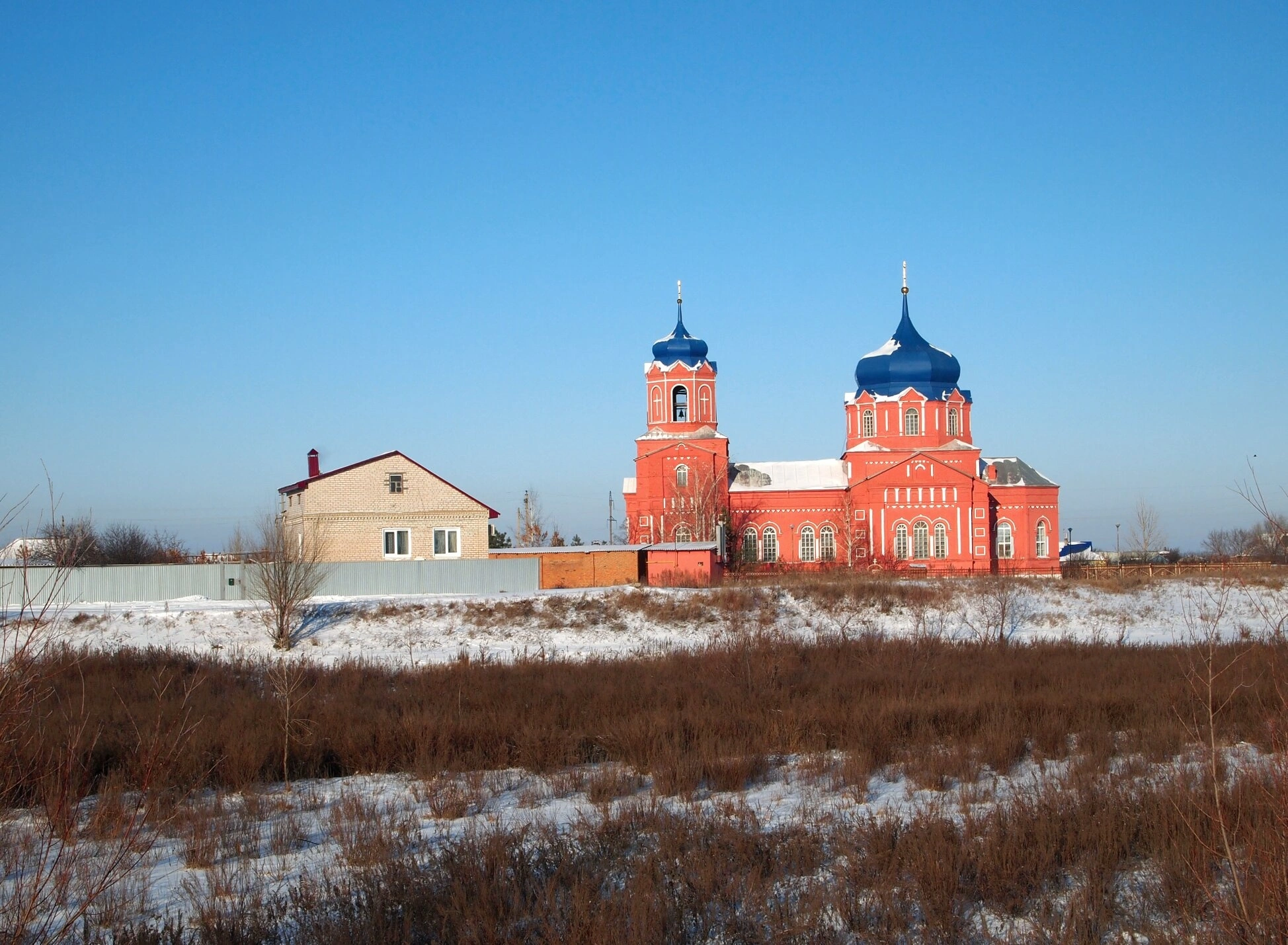 Окружает святыню спокойный зимний пейзаж. Слева от церкви видно небольшое одноэтажное здание светло-бежевого цвета с коричневой двускатной крышей. Территория ограждена белым металлическим забором и кирпичной оградой. Передний план занимает заснеженное поле с примёрзшей сухой растительностью, а над всем простирается чистое ярко-голубое небо. Солнечный свет, падающий слева, отбрасывает чёткие тени и живописно подчёркивает яркость красок церковного строения.