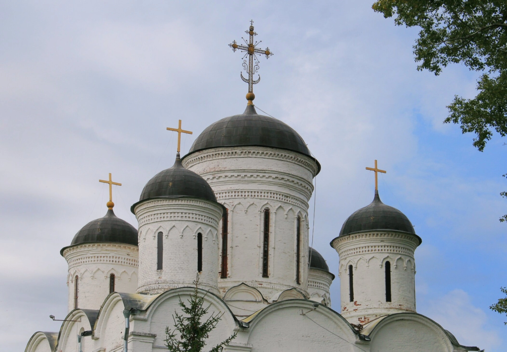 На фотографии ясно видны пять мощных световых барабанов, увенчанных тёмными куполами луковичной формы и сияющими православными крестами. Центральная глава, самая высокая и широкая, вместе с четырьмя боковыми, создаёт гармоничную пирамидальную композицию, воплощающую идею духовного предстояния. Барабаны, сложенные из белого камня, украшены изящным аркатурно-колончатым поясом — традиционным элементом древнерусской архитектуры, придающим строению лёгкость и стройность. Узкие арочные окна-бойницы напоминают о том, что храм в древности был частью крепостных сооружений форпоста Тверского княжества.