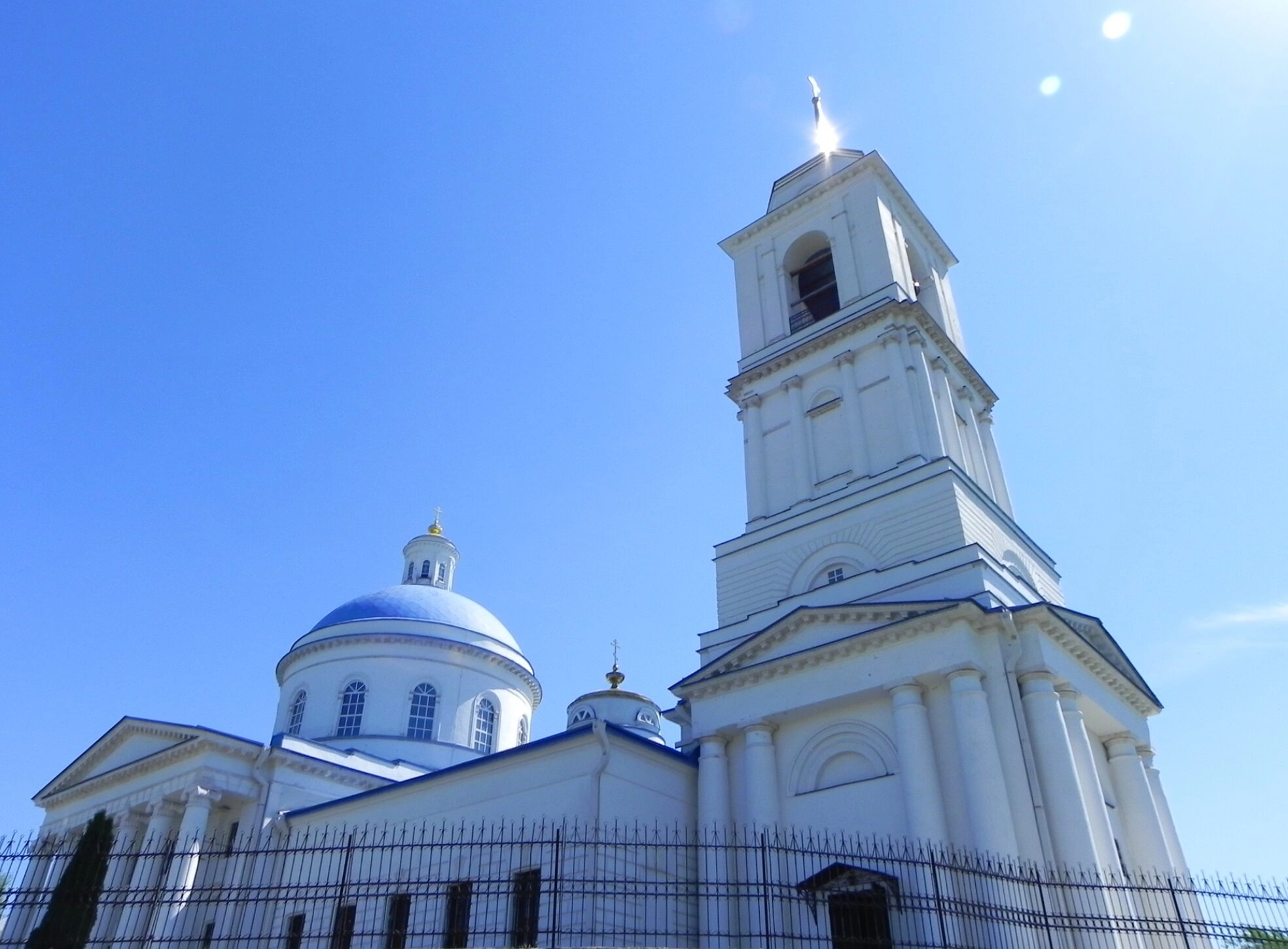 Фасад здания оштукатурен и выбелен, что подчёркивает чистоту и благолепие святыни. Декоративное убранство выполнено из белого камня: изящные пилястры, арочные оконные проёмы, обрамлённые наличниками, и строгий классический фриз придают облику храма торжественность и строгость. Снимок сделан в ясный день, и чистое голубое небо, яркий солнечный свет подчёркивают белизну стен и лазурную яркость купола, создавая образ небесной обители.