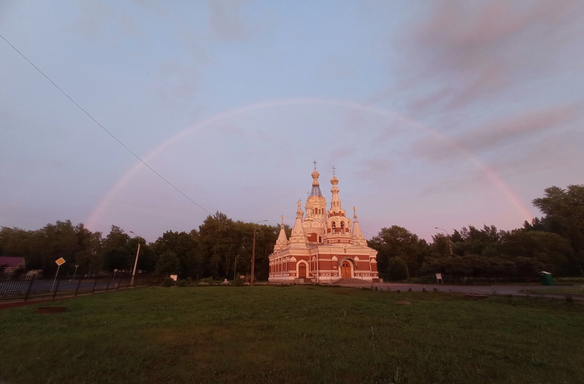 Снимок сделан в тёплое время года: собор окружён сочной зеленью деревьев и ухоженным луговым передним планом. Особую, благодатную атмосферу кадра создаёт радуга, сияющая в небе над храмом. Это природное явление, возникшее после дождя, воспринимается как символический знак завета между Богом и человеком, усиливая молитвенное настроение, которое передаёт фотография.