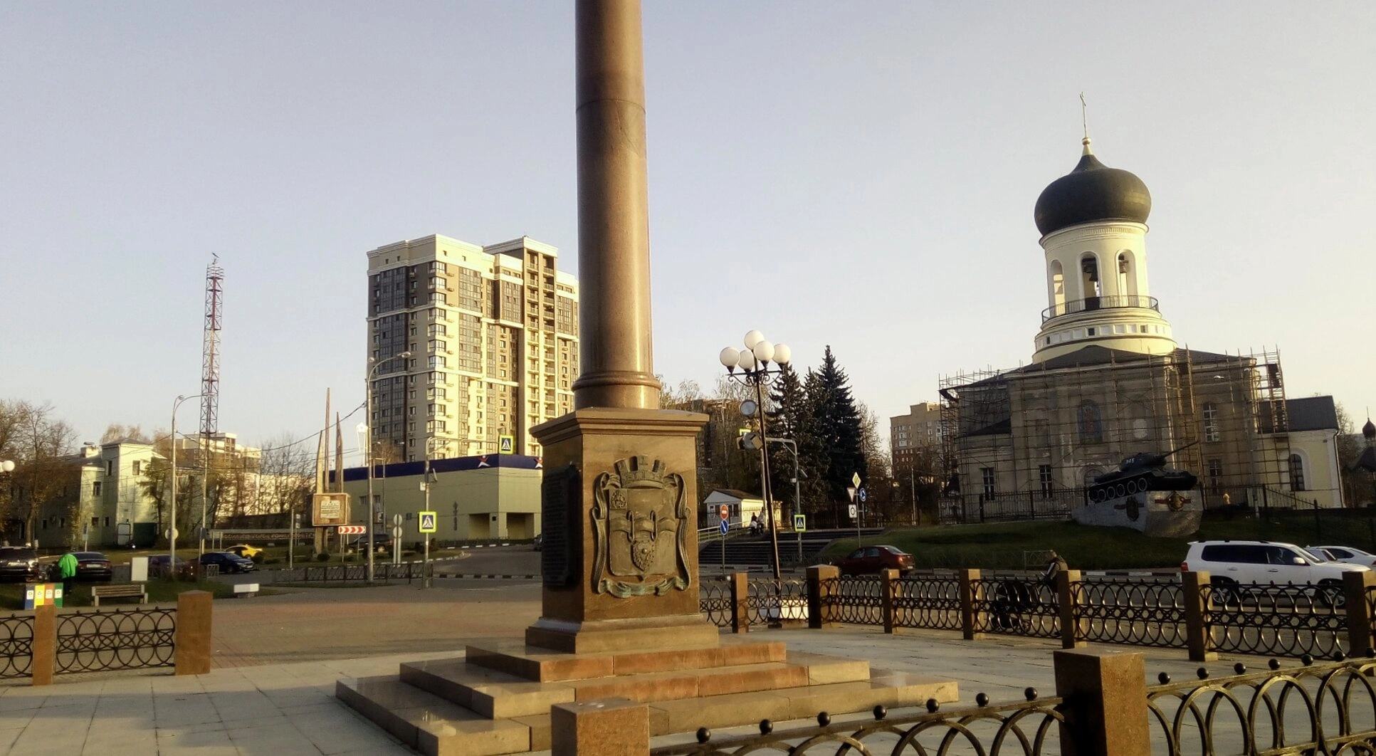Собор расположен в историческом центре города, на берегу реки Нары. На переднем плане виден массивный гранитный столб – памятник «Город воинской славы», а также кованое ограждение. Слева от храма возвышается современный жилой комплекс, на заднем плане просматриваются деревья и элементы городской инфраструктуры. Часть фасада собора закрыта строительными лесами, что свидетельствует о ведущихся реставрационных работах.