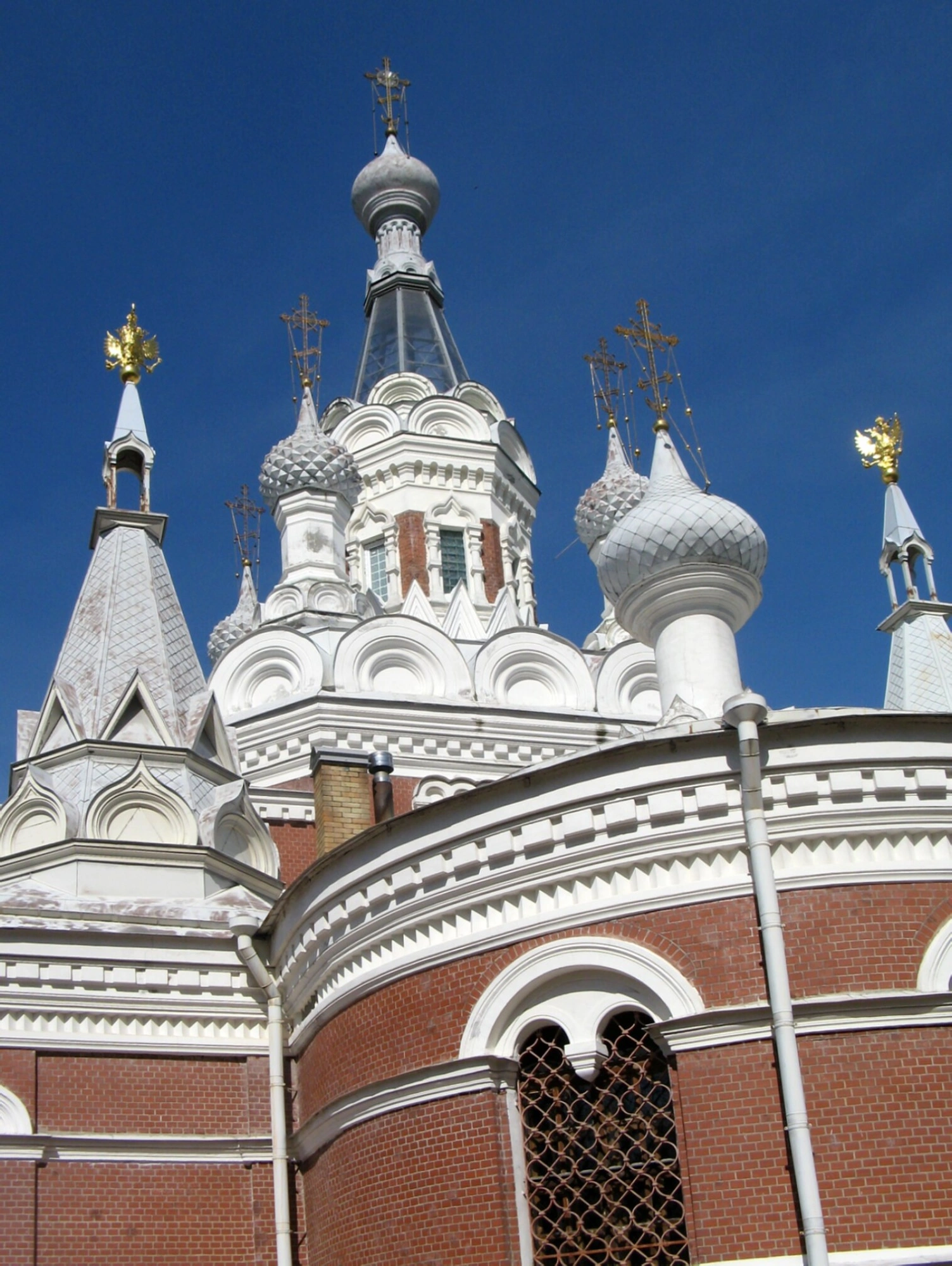 Храм представляет собой выдающийся образец русского стиля в церковной архитектуре. Его стены сложены из французского красно-коричневого кирпича, а декоративные элементы оштукатурены и побелены. Собор увенчан пятью главами, центральная из которых является самой крупной и завершается луковичной главкой с золочёным крестом. По углам здания возвышаются шатровые башни, украшенные двуглавыми орлами. Фасад украшают характерные арочные окна с металлическими решётками, зубчатые карнизы (поребрик) и полукруглые кокошники у основания центрального купола. Все кресты на храме золочёные, что придает ему особую торжественность.