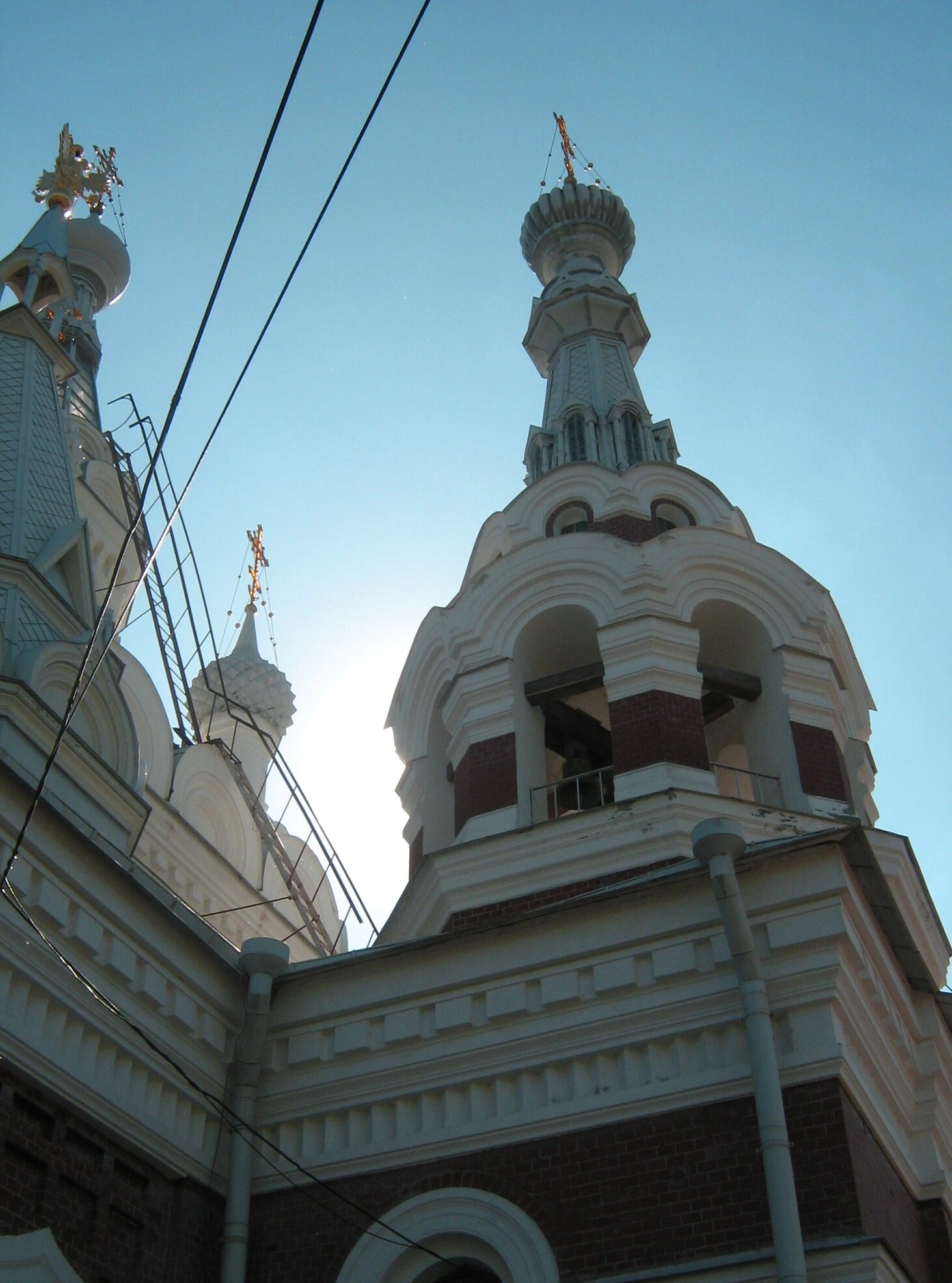 Освещение на фотографии контровое: яркое солнце находится прямо за центральным куполом, создавая сильные лучи и подчёркивая силуэт храма. Чистое голубое небо служит фоном, на котором чётко видны архитектурные детали — белые пилястры, декоративные пояса, а также чёрные электрические провода и белая водосточная труба на правой стороне здания.
