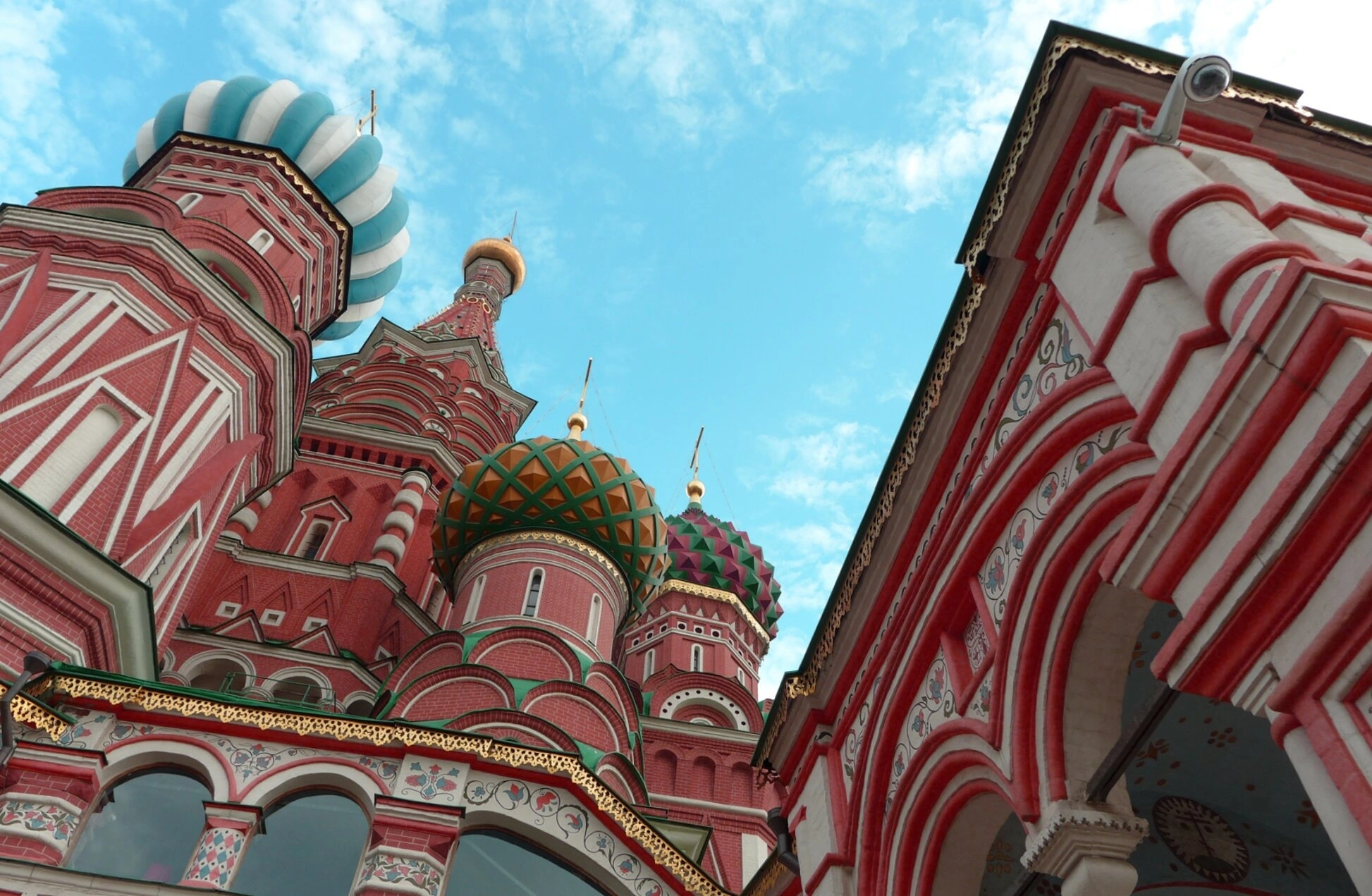 Справа в кадре видна часть арки пристроя, что позволяет оценить комплексный, составной характер всего архитектурного ансамбля, состоящего из девяти церквей на общем основании. Расположенный по координатам 55.7525° северной широты и 37.62305556° восточной долготы, этот собор был возведён в середине XVI века по повелению царя Ивана Грозного в честь победы над Казанским ханством. Ныне он является объектом всемирного наследия ЮНЕСКО и действующим храмом Русской Православной Церкви, привлекающим паломников и туристов со всего мира.