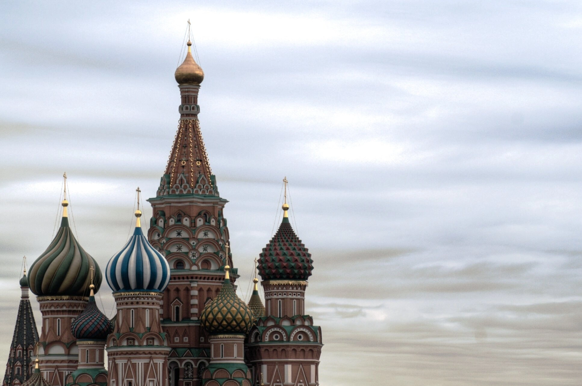 Взгляд приковывают к себе уникальные разноцветные главы собора, каждая из которых венчает отдельный престол, объединённый в единый собор. Центральный шатёр, увенчанный малым шатриком с восьмиконечным крестом, отличается сложным узором из кирпича терракотового оттенка. Слева от него видна глава зелёных тонов с золотистой спиралью, устремлённой к небесам, что символизирует духовное восхождение. Справа сияет купол с геометрическим ромбовидным узором, сочетающим красные, зелёные и жёлтые оттенки, напоминая о нетленной красоте Небесного Иерусалима. Пасмурное, облачное небо на фоне создаёт благостный и строгий контраст, оттеняя яркое многоцветие святых глав и подчёркивая монументальность древней кладки из красного кирпича.