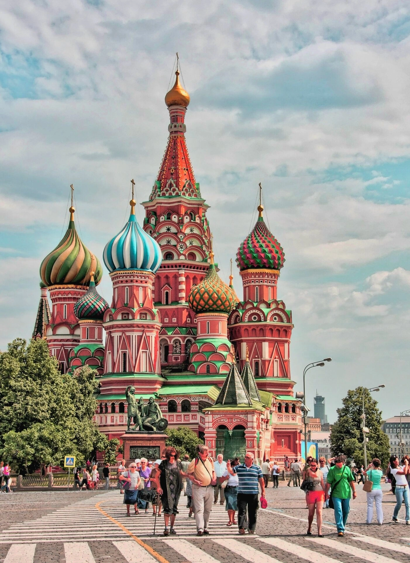 Исторически до XVII века собор именовали Троицким, ибо возведён он был рядом с древней деревянной церковью во имя Святой Троицы. Нынешнее народное название закрепилось за ним по имени московского чудотворца Василия Блаженного, чьи мощи почивают в одном из приделов храма. На переднем плане фотографии виден оживлённый пешеходный переход, где в летнее время движется поток людей, что подчёркивает неразрывную связь святыни с повседневной жизнью города. Слева от собора можно различить монумент народным героям Кузьме Минину и князю Дмитрию Пожарскому.