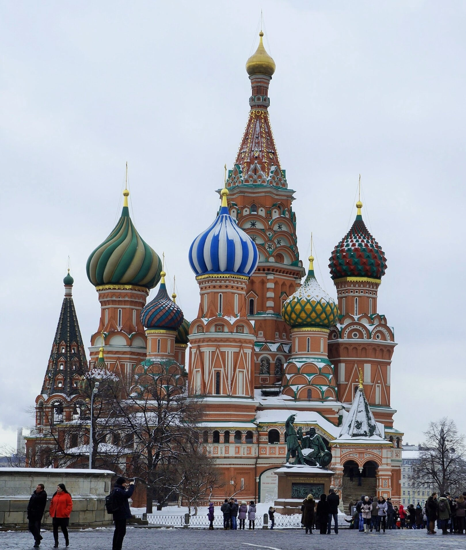 На представленной фотографии запечатлён один из главных символов России и величайший памятник русского церковного зодчества — Собор Покрова Пресвятой Богородицы, что на Рву, более известный в народе как Храм Василия Блаженного. Воздвигнутый в середине XVI века по повелению царя Иоанна Грозного в честь взятия Казанского ханства, собор является не только архитектурным чудом, но и живым свидетельством истории Православия на Руси. Его уникальный ансамбль, состоящий из девяти отдельных церквей на едином основании, увенчанных дивными разноцветными главами, предстаёт в зимнем убранстве. Снежный покров мягко ложится на брусчатку Красной площади и ступени собора, подчёркивая благородство красного кирпича фасадов и праздничную яркость керамических изразцов. Небесная сень в этот день скрыта лёгкой дымкой, что придаёт всему образу собора особую, возвышенную и строгую красоту. Люди, изображённые на переднем плане и в окружении храма, позволяют зрителю ощутить масштаб и величие этого священного места, привлекающего паломников и путешественников со всего мира.
