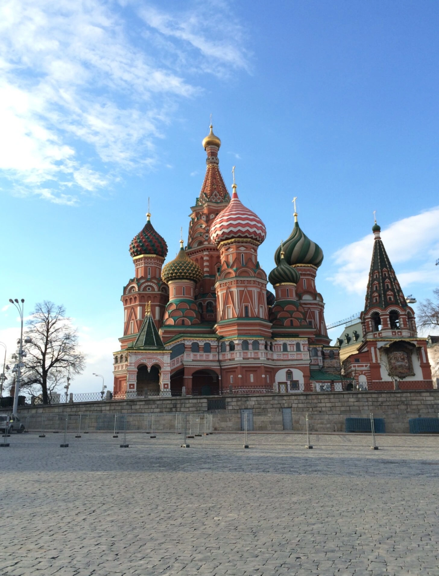 На представленной фотографии собор снят в ясную погоду. Голубое небо с лёгкими облаками служит идеальным фоном, оттеняющим яркость куполов. Мощение Красной площади на переднем плане и голые ветви деревьев, вероятно, указывают на позднюю осень или раннюю весну. Мягкий солнечный свет, падающий на восточные и южные фасады, живописно выявляет фактуру материалов и богатство цветовой палитры, от тёплых оттенков кирпича до сияния позолоченных крестов. Людей на переднем плане или крупным планом на снимке не наблюдается, что позволяет в полной мере сосредоточить внимание на величии и красоте самого архитектурного шедевра.