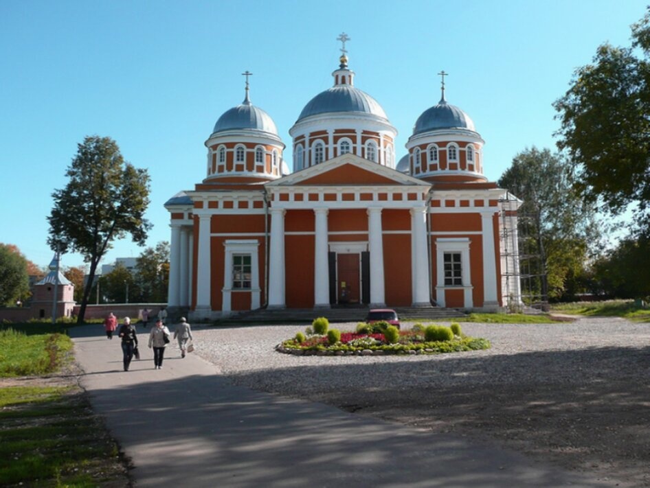 На представленной фотографии запечатлён величественный Собор Рождества Христова, являющийся главным храмом Христорождественского женского монастыря в Твери. Это выдающийся памятник церковной архитектуры первой трети XIX века, созданный по проекту знаменитого зодчего Карла Росси. Собор располагается в живописной местности на левом берегу реки Тьмаки, в заволжской части города.