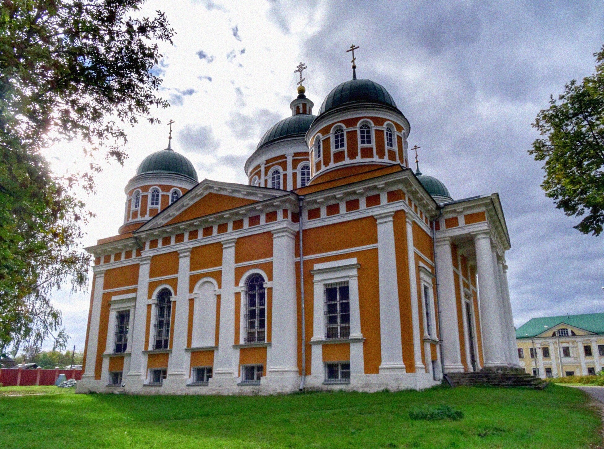 На фотографии запечатлён величественный Собор Рождества Христова, являющийся главным храмом старинного Христорождественского женского монастыря в Твери. Монументальное каменное здание с оранжевыми стенами и белоснежным архитектурным убранством dominates the foreground of the image. Его венчают зелёные купола, устремившиеся в небесную высь и увенчанные златыми крестами, сияющими как символы победы жизни над смертью.