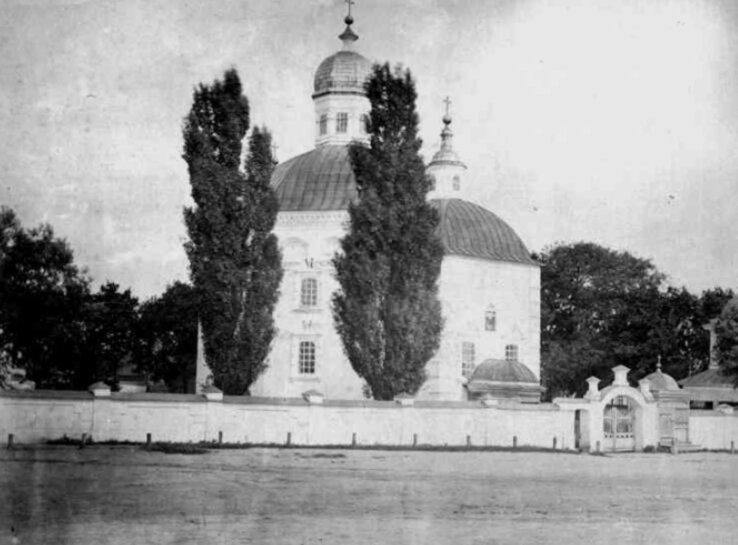 На исторической чёрно-белой фотографии запечатлён величественный Стародубский собор в честь Рождества Христова, известный в народе как Старый Казацкий собор. Этот православный храм является одной из главных духовных и архитектурных доминант города Стародуба и выдающимся памятником украинского барокко, возведённым в XVIII столетии на средства стародубского казачества.