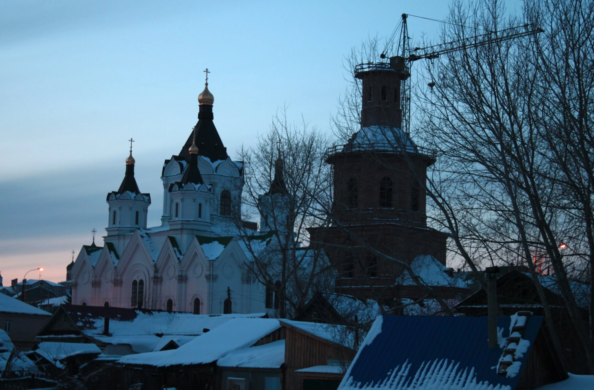 Справа от собора можно наблюдать строящееся или реставрируемое архитектурное сооружение, вероятно, являющееся колокольней, рядом с которым видна конструкция строительного крана. Это указывает на непрекращающиеся работы по восстановлению и сохранению духовного наследия этого святого места. На переднем плане простираются заснеженные крыши городских построек и ветви деревьев, подчёркивая умиротворённость и неспешный ритм жизни старинного русского города.