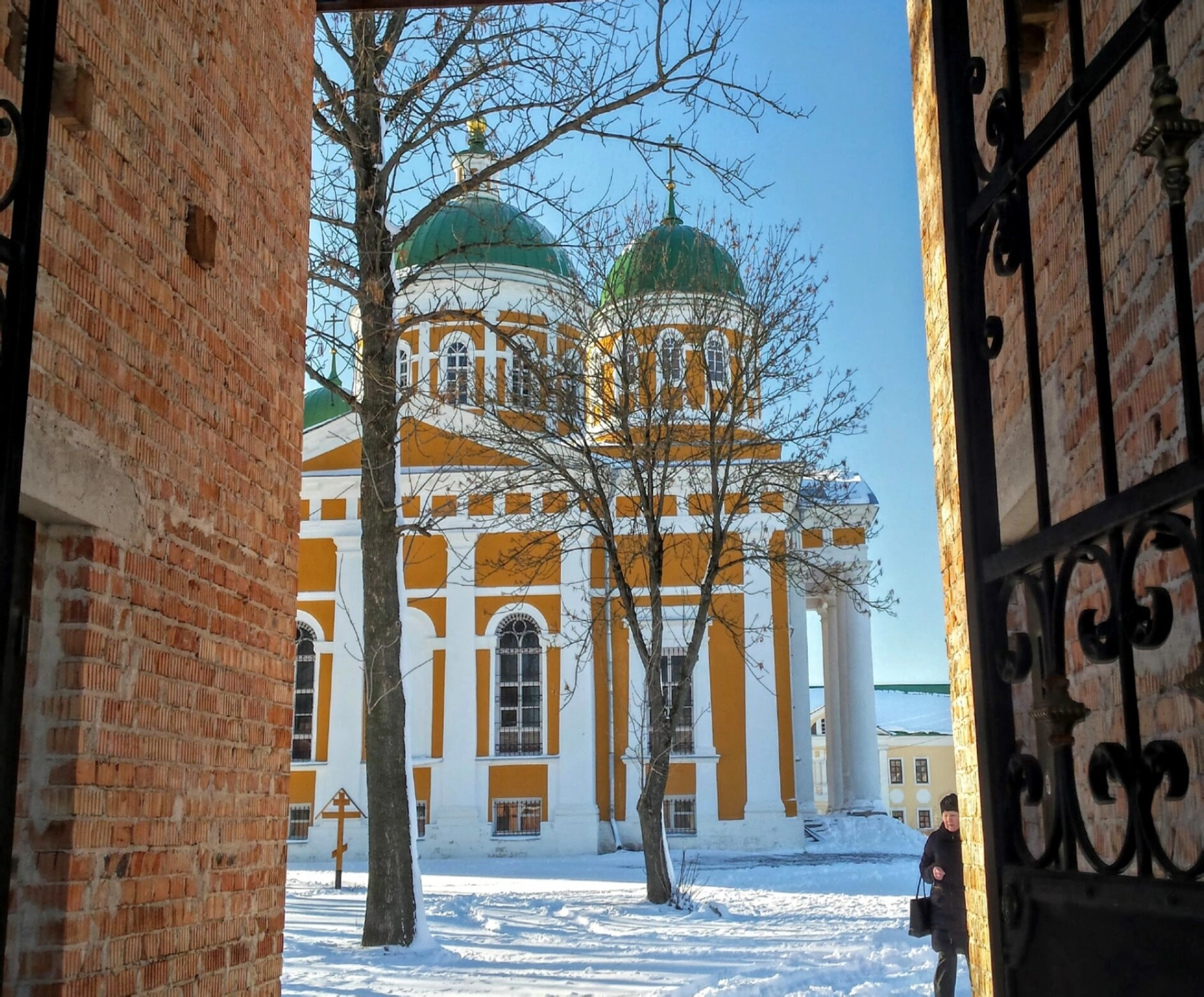 На фотографии запечатлён величественный вид на собор Рождества Христова, являющийся главным храмом женского Христорождественского монастыря в городе Твери. Святая обитель, основанная в XV веке святителем Арсением, епископом Тверским, исторически именуется как монастырь Рождества Христова, что на Горках. Через арочный проём открывается прекрасный вид на соборный храм, чьи солнечно-жёлтые стены и тёмно-зелёные купола, увенчанные златными крестами, символизируют благодать и духовную славу православия.
