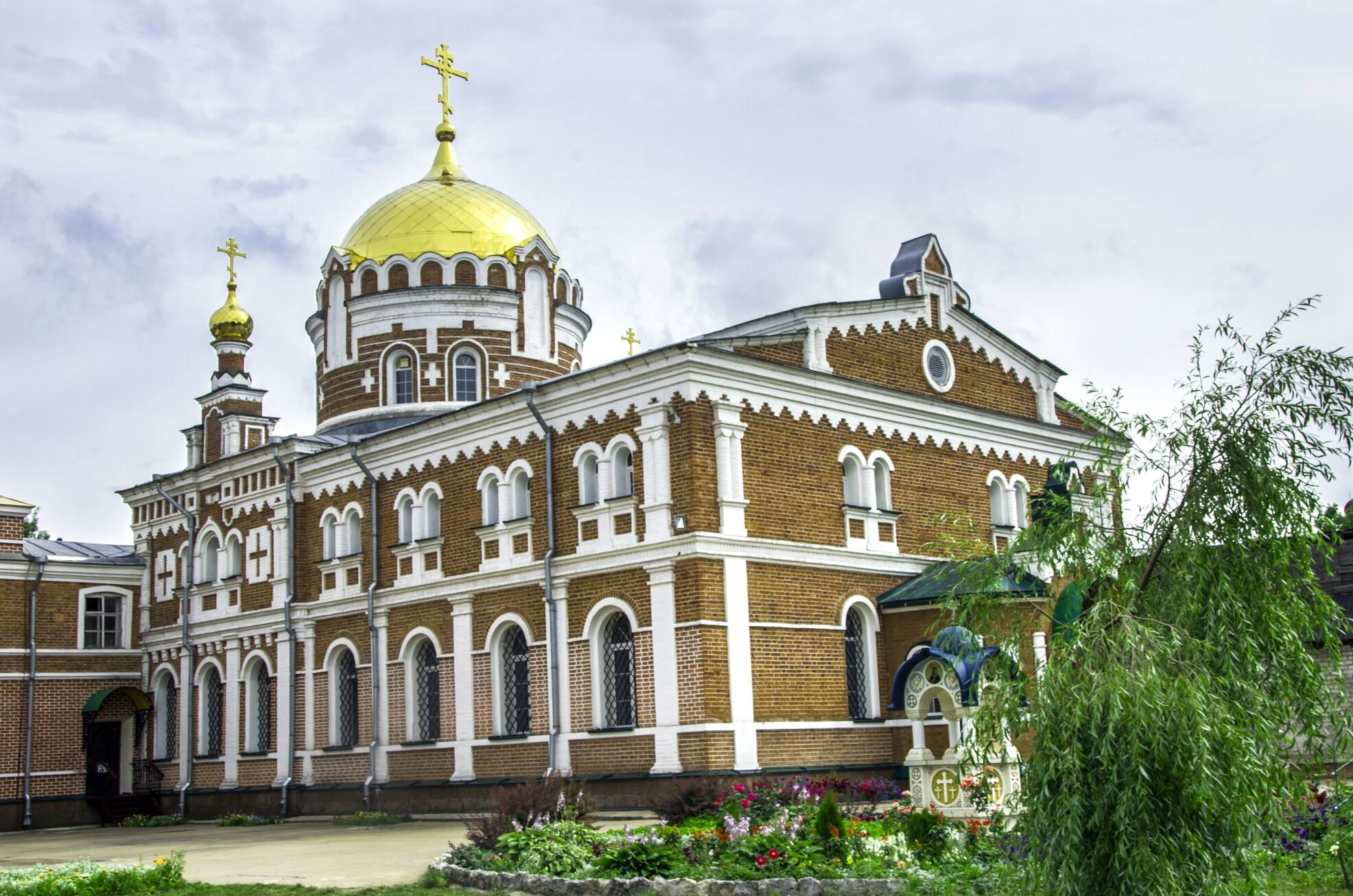 Перед храмом простирается ухоженная территория монастыря: зелёный цветник и склонившиеся ветви плакучей ивы, что придаёт всей композиции особую умиротворённость и благодатный покой. Монастырь, переживший годы запустения в советский период, был возрождён к жизни в 1994 году и ныне является действующим женским монастырём Вятской епархии. Эта фотография не только передаёт архитектурную красоту православной святыни, но и свидетельствует о торжестве веры и непрерывности духовной традиции на русской земле.