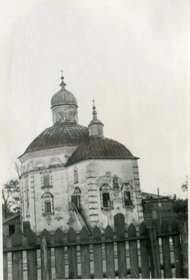 На переднем плане фотографии виден деревянный забор, отделяющий соборную территорию. Общее состояние храма на момент съёмки, относящейся к периоду 1941-1943 годов, свидетельствует о его почтенном возрасте и сложном историческом периоде. Чёрно-белый характер изображения подчёркивает историческую ценность кадра и передаёт атмосферу того времени. Несмотря на видимые следы времени, собор сохраняет своё величие и духовную значимость, оставаясь важным объектом культурного и исторического наследия Стародуба.