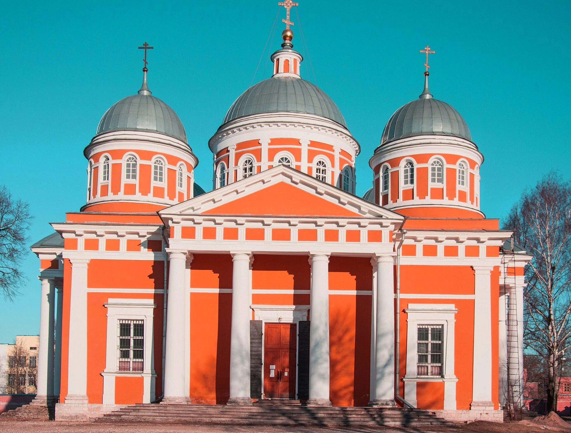 На представленной фотографии запечатлён величественный Собор Рождества Христова, являющийся главным храмом Тверского Христорождественского женского монастыря. Снимок сделан в ясный день, благодаря чему солнечный свет мягко освещает нарядные оранжевые фасады здания, богато украшенные белоснежными декоративными элементами и лепниной, что подчёркивает торжественность и благолепие архитектурного облика.