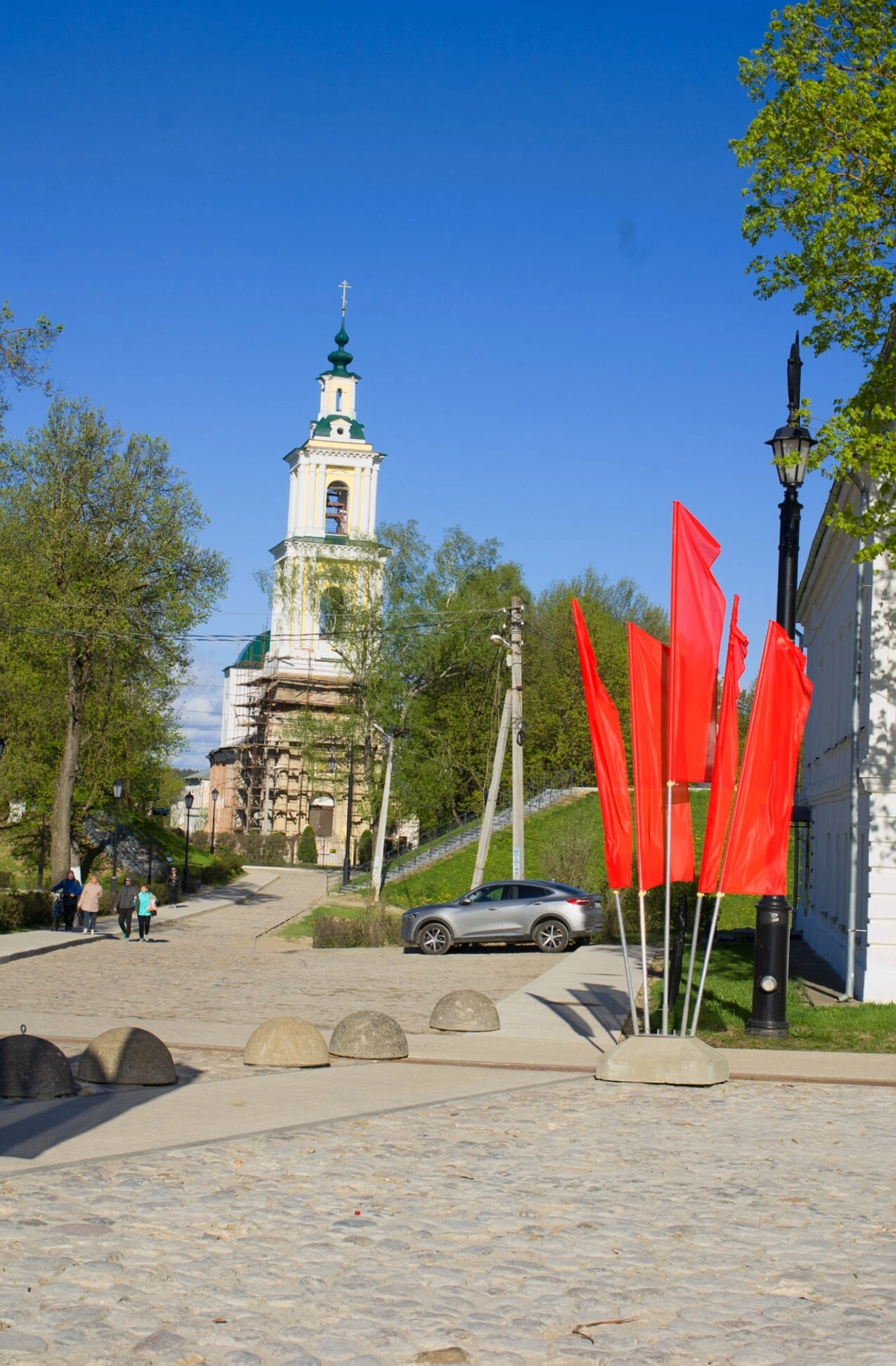 Перед храмом расположена мощёная камнем площадь, где установлены красные флаги на чёрных флагштоках. Полукруглые каменные ограждения добавляют композиции законченность и гармонию. На среднем плане виден припаркованный автомобиль, свидетельствующий о современной жизни рядом с исторической святыней.