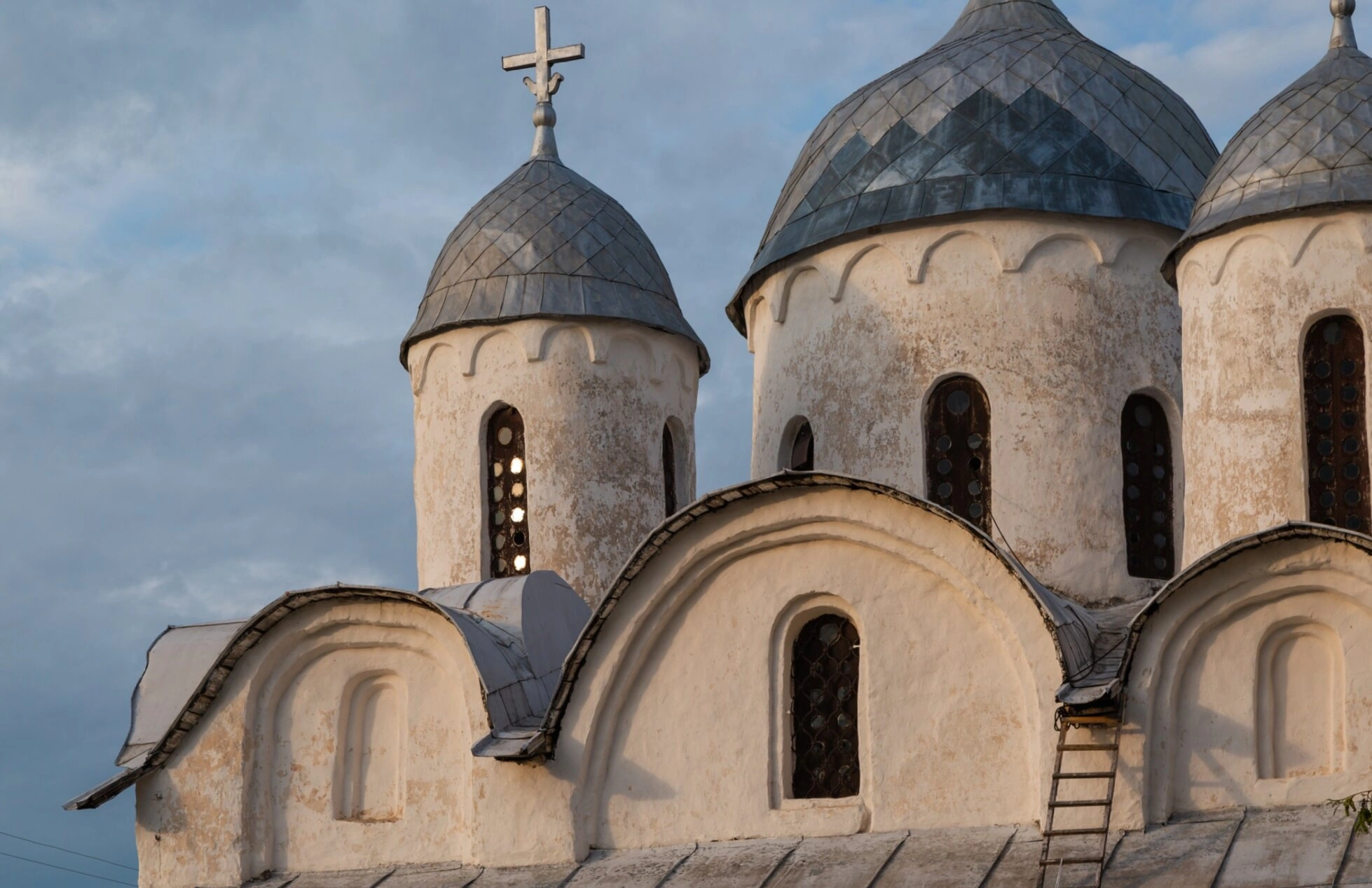 Снимок позволяет детально рассмотреть архитектурный облик собора, одного из старейших в Пскове. В кадре доминируют мощные, устремлённые в небо купола-луковки, характерные для псковской храмовой школы. Центральный купол, увенчанный восьмиконечным православным крестом, символизирует Господа Иисуса Христа, как главу Церкви. Барабаны куполов прорезаны узкими оконцами-слухами, освещающими внутреннее пространство храма.