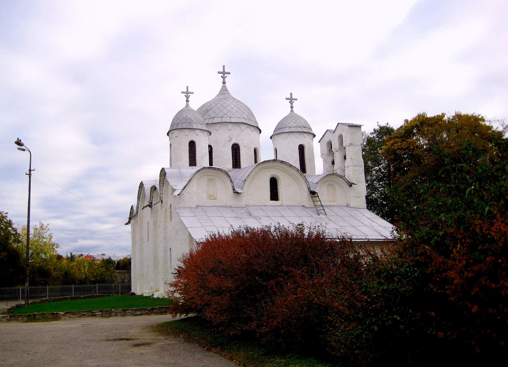 На представленной фотографии запечатлён собор Рождества святого славного Пророка, Предтечи и Крестителя Господня Иоанна, являющийся главным храмом древнейшего Ивановского монастыря в Пскове. Этот величественный белоснежный храм, увенчанный тремя шлемовидными куполами с воздвигнутыми на них православными крестами, представляет собой выдающийся памятник древнерусского зодчества XII столетия.