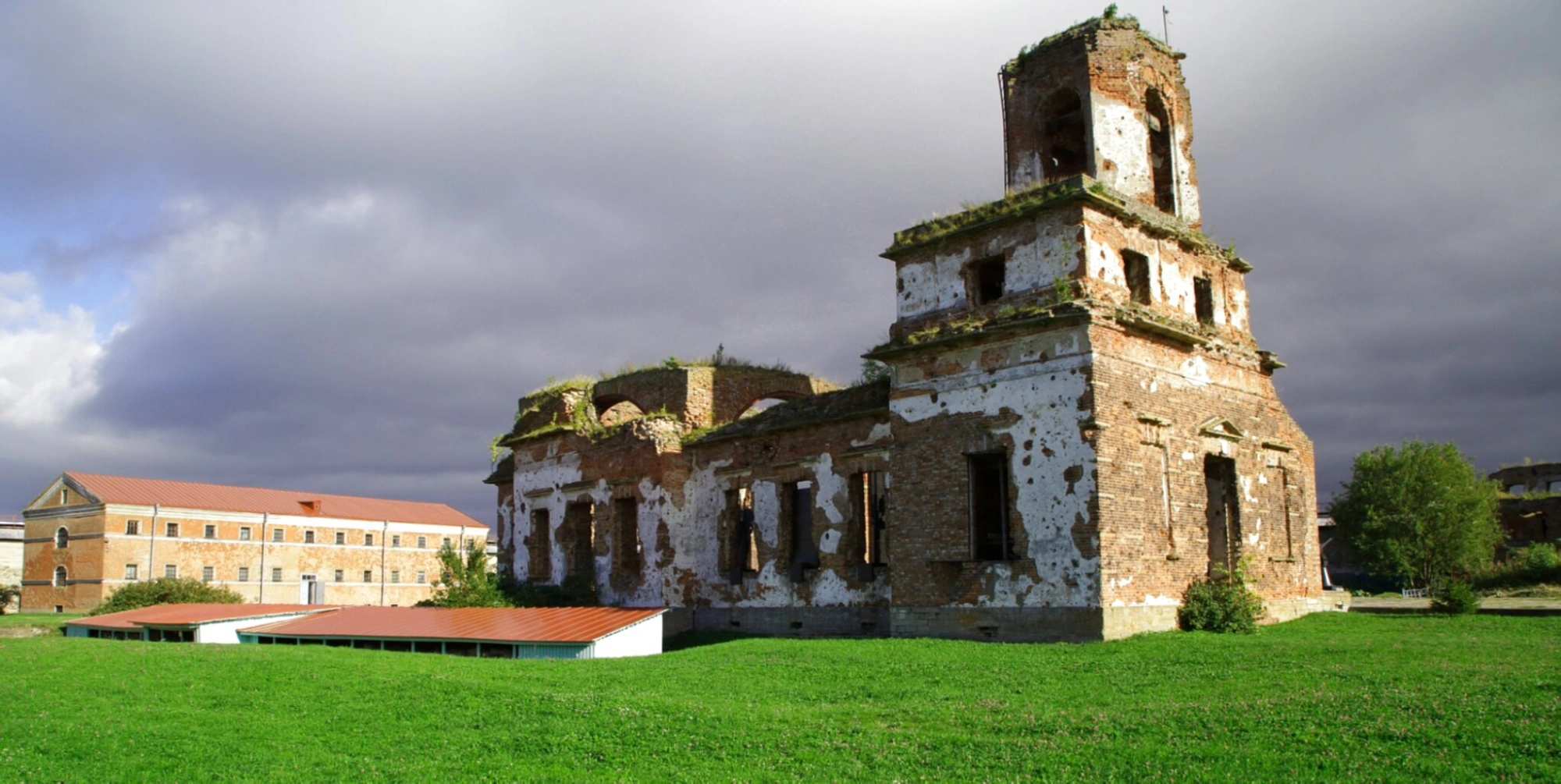 На представленной фотографии запечатлён скорбный вид руин собора в честь Рождества святого славного пророка, Предтечи и Крестителя Господня Иоанна, расположенного в историческом сердце крепости Орешек на Ореховом острове. Храм, освящённый в 1828 году, был возведён в стиле классицизма по проекту архитектора А. Е. Штауберта и первоначально служил гарнизонной церковью для русского воинства.