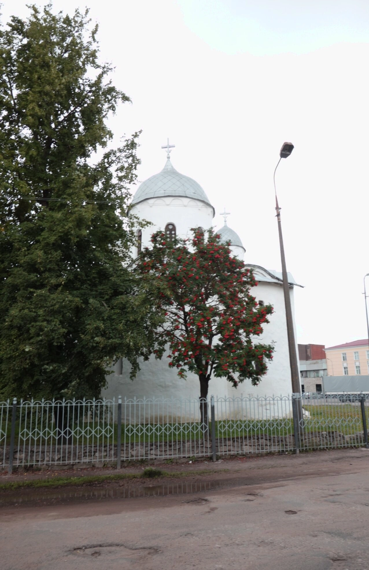 Собор, основанный в первой половине XII века супругой князя Изяслава Мстиславича, является одним из древнейших памятников псковской архитектурной школы. Его стены помнят молитвы многих поколений православных христиан. Особую ценность представляют уникальные фресковые росписи XII века, сохранившиеся внутри храма и имеющие огромное значение для истории древнерусского искусства. На заднем плане фотографии виднеются другие городские строения, что подчёркивает гармоничное сочетание древней святыни с современным городским ландшафтом, а уличный фонарь справа напоминает о том, что храм является духовным светочем для всех жителей и гостей города.