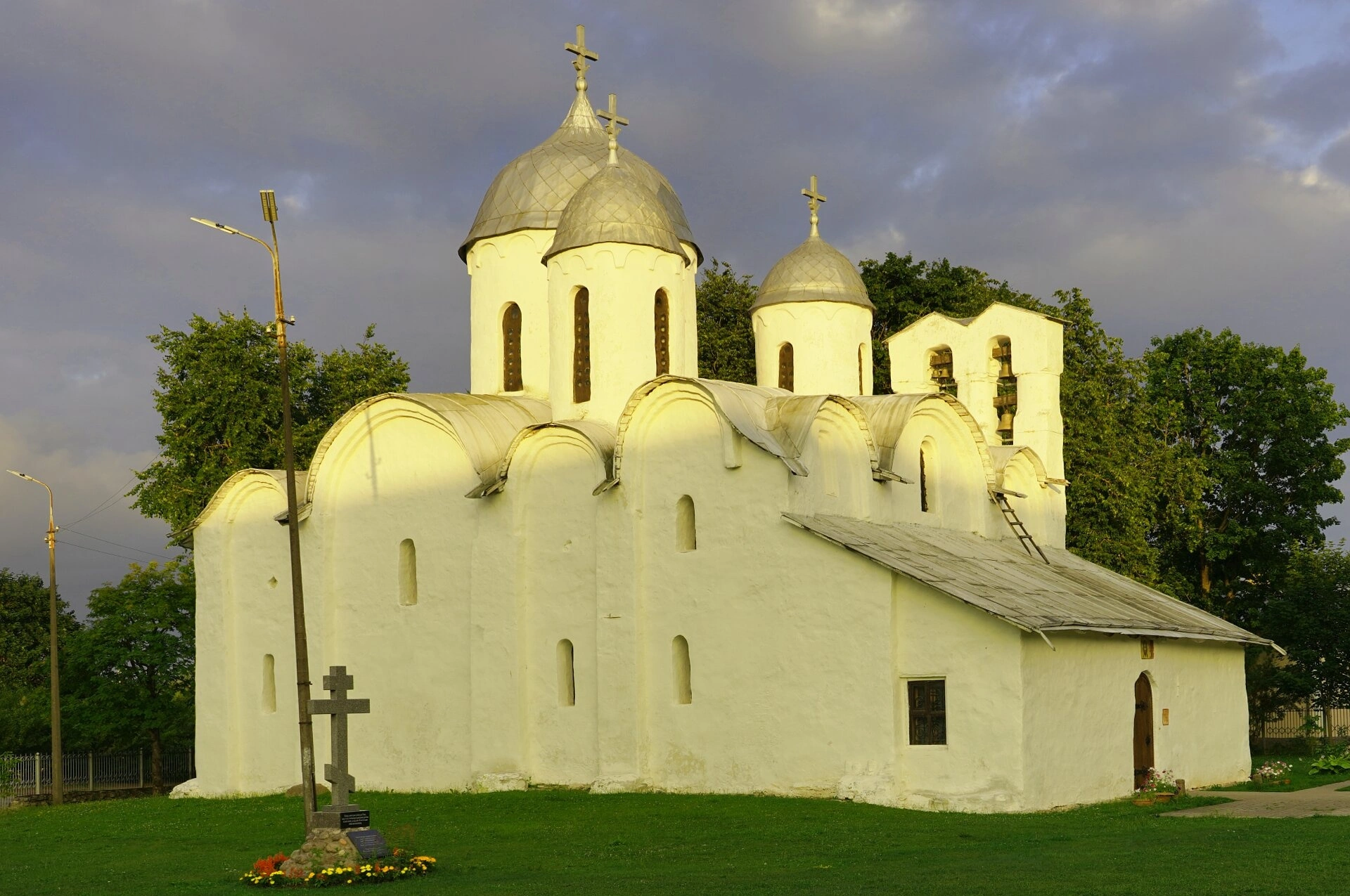 Собор, чьи точные координаты 57.82585800; 28.31814100, представляет собой выдающийся памятник псковской архитектурной школы XII века. Храм обладает характерными чертами: мощными стенами, щелевидными окнами, позакомарным покрытием и шлемовидными куполами, что придаёт ему строгий и величественный вид. На снимке хорошо просматривается трёхпролетная звонница, органично вписанная в структуру храма, что также является отличительной особенностью псковского зодчества.