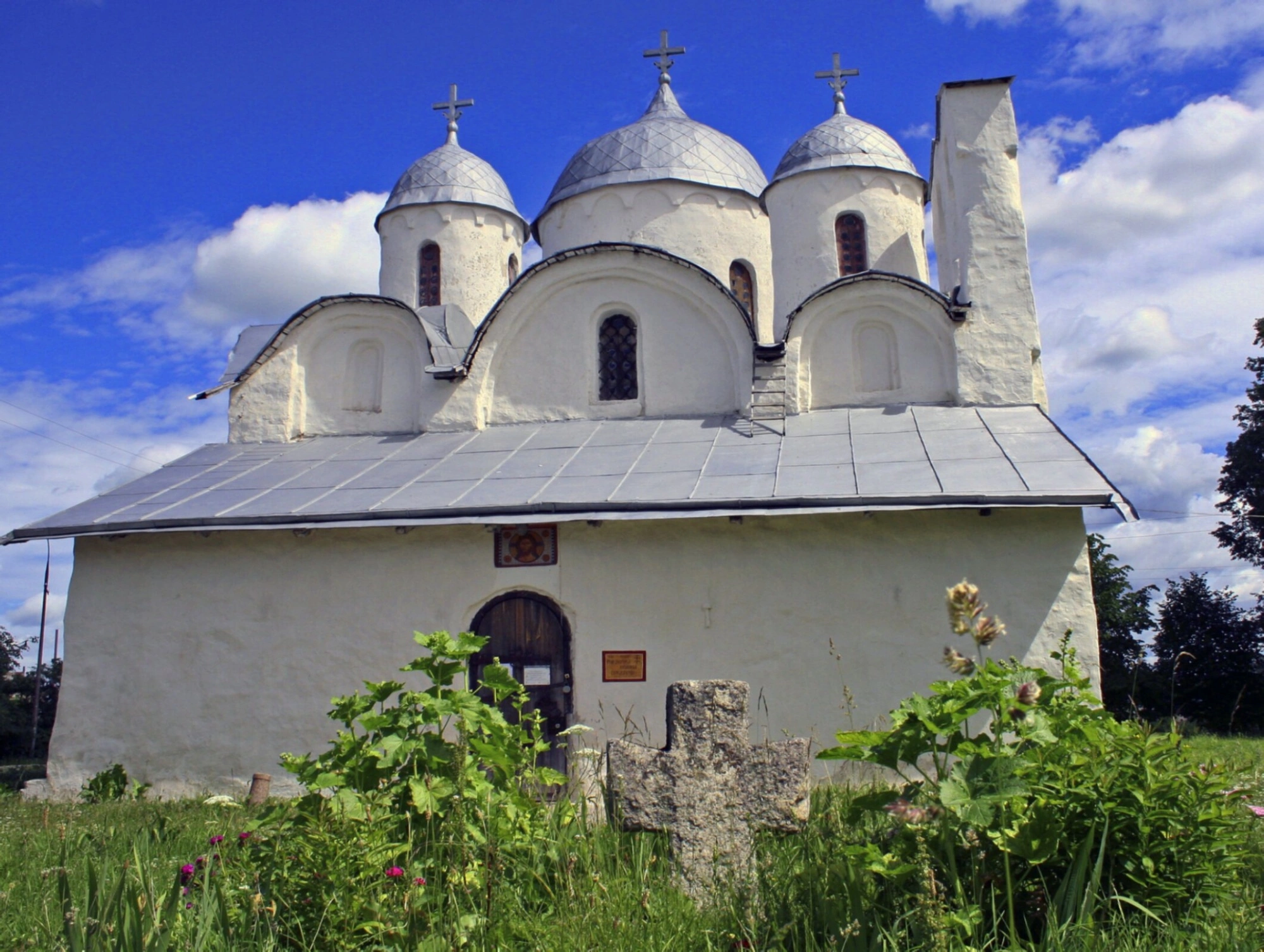 На представленной фотографии запечатлён величественный облик собора Рождества честного славного Пророка, Предтечи и Крестителя Господня Иоанна, древнейшей православной святыни Пскова. Храм располагается в живописной местности на берегу реки Великой, в историческом районе Завеличье, и является выдающимся памятником древнерусского зодчества XII столетия.