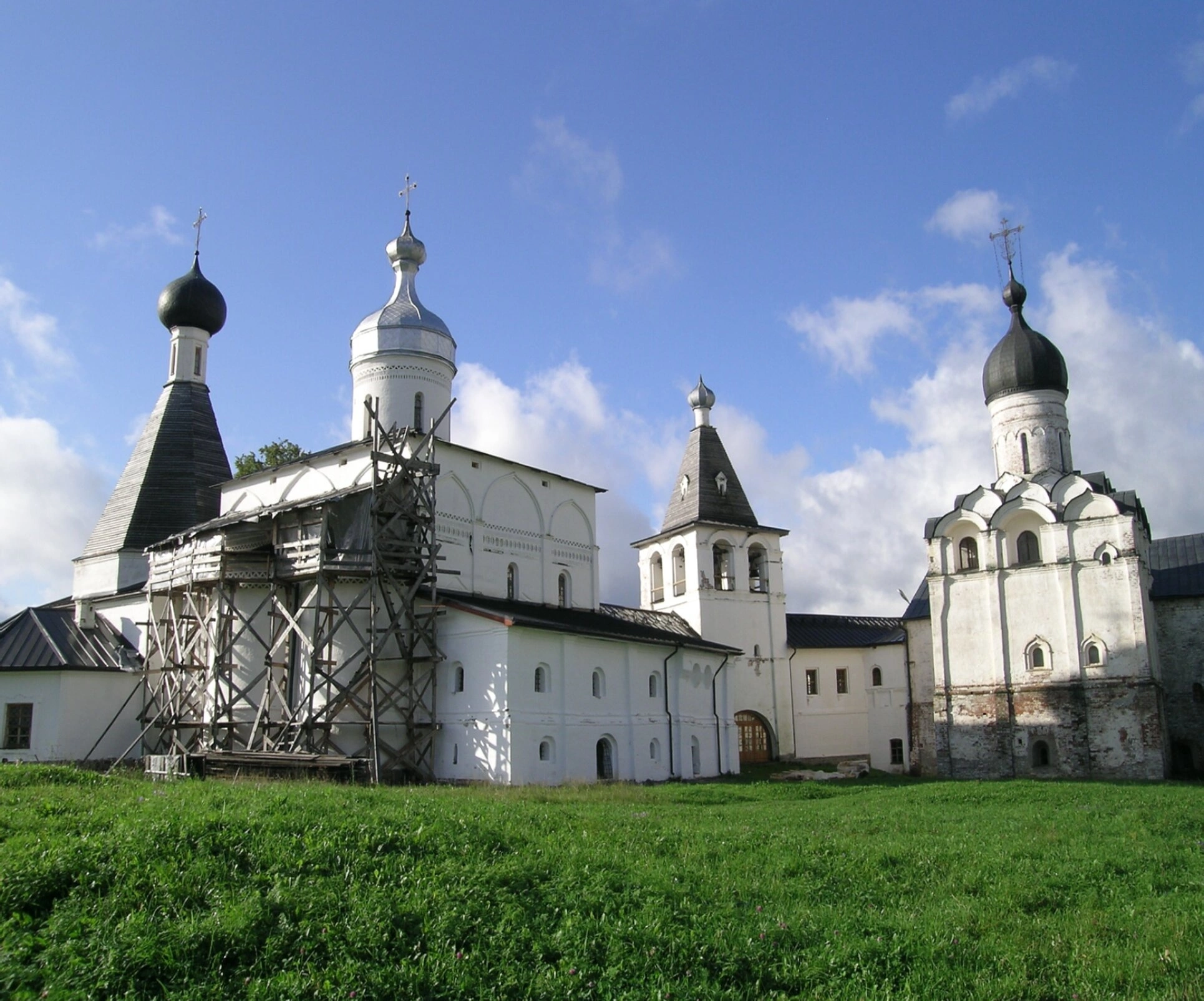 Белокаменный собор, доминирующий на снимке, был возведён в 1490 году и представляет собой классический образец раннемосковского храмового строительства. Его строгие и лаконичные формы, увенчанные шлемовидными куполами, гармонично вписаны в окружающий природный ландшафт. Монастырская стена, окружающая святыню, символизирует духовную твердыню и отделяет мир горний от мира дольнего.