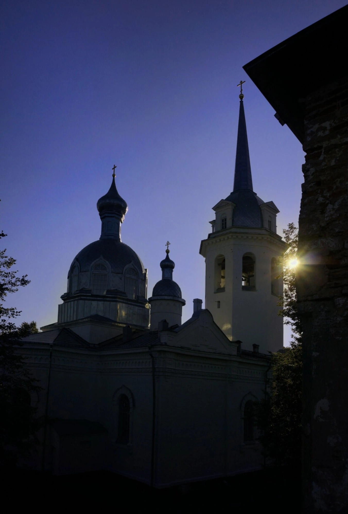 Снимок выполнен в контровом свете, что создает возвышенный образ храмового комплекса. Солнечные лучи, пробивающиеся из-за колокольни, символически освещают святыню, подчеркивая её духовное значение. Архитектурный ансамбль включает основной объём храма, увенчанный традиционным куполом, и высокую колокольню, характерную для севернорусского зодчества.