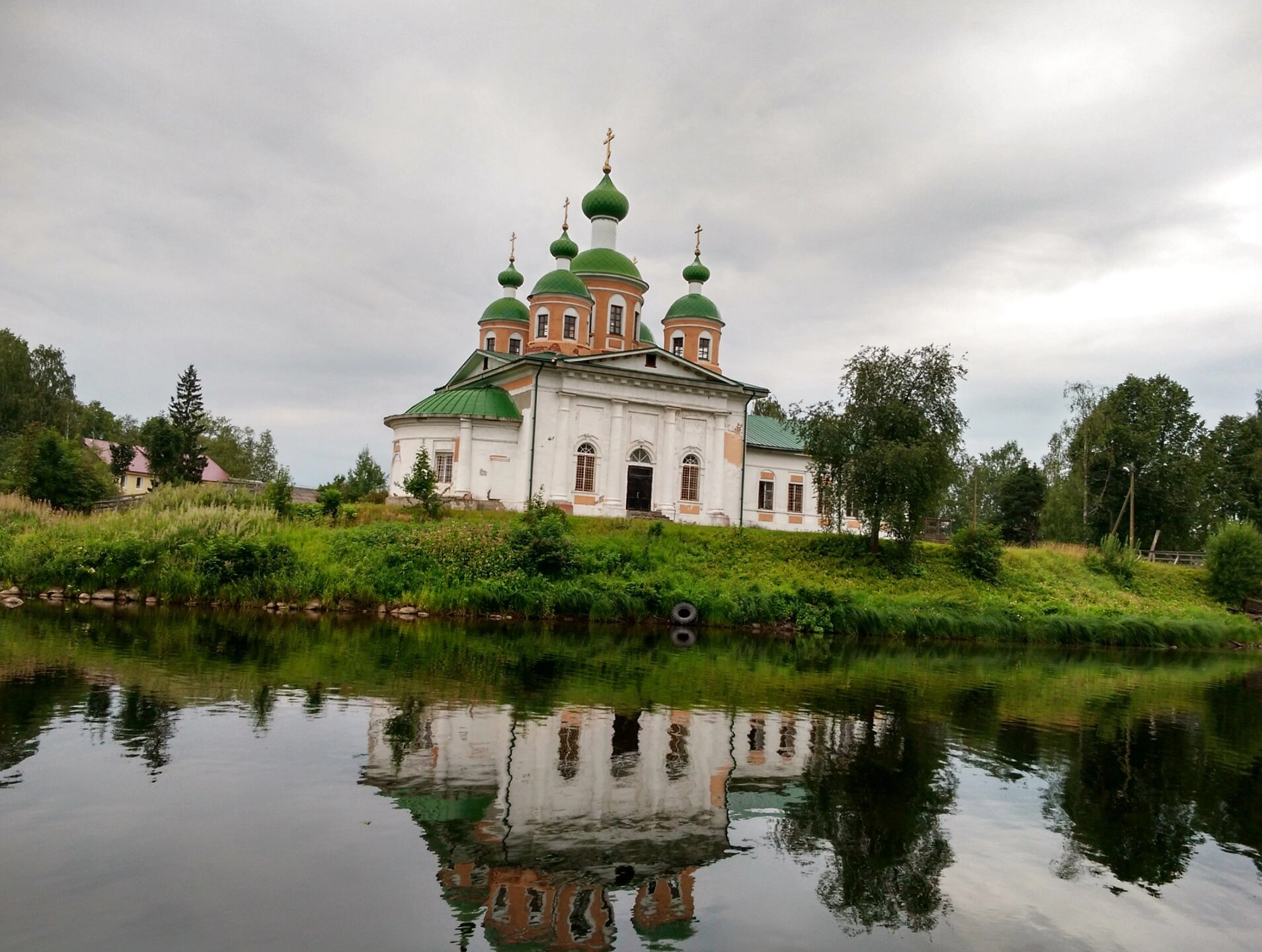На представленной фотографии запечатлён величественный Собор Смоленской иконы Божией Матери, расположенный в историческом городе Олонце Республики Карелия. Храм стоит на святом месте — острове Мариам, образованном слиянием рек Олонки и Мегреги, что придаёт ему особую духовную значимость и живописность.