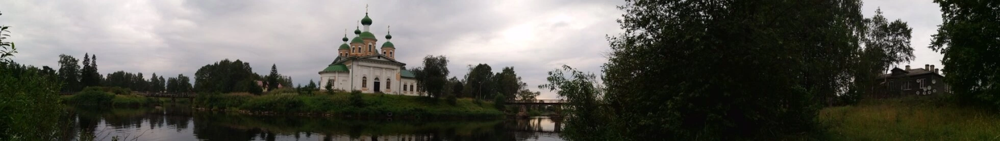На снимке храм предстаёт в окружении природной красоты русского Севера. Пышная зелень деревьев обрамляет собор, а водная гладь реки Мегреги придаёт композиции особую глубину и умиротворение, подчёркивая неразрывную связь творения рук человеческих с Божьим миром. На заднем плане угадываются очертания городских построек и моста, органично вписанных в ландшафт.