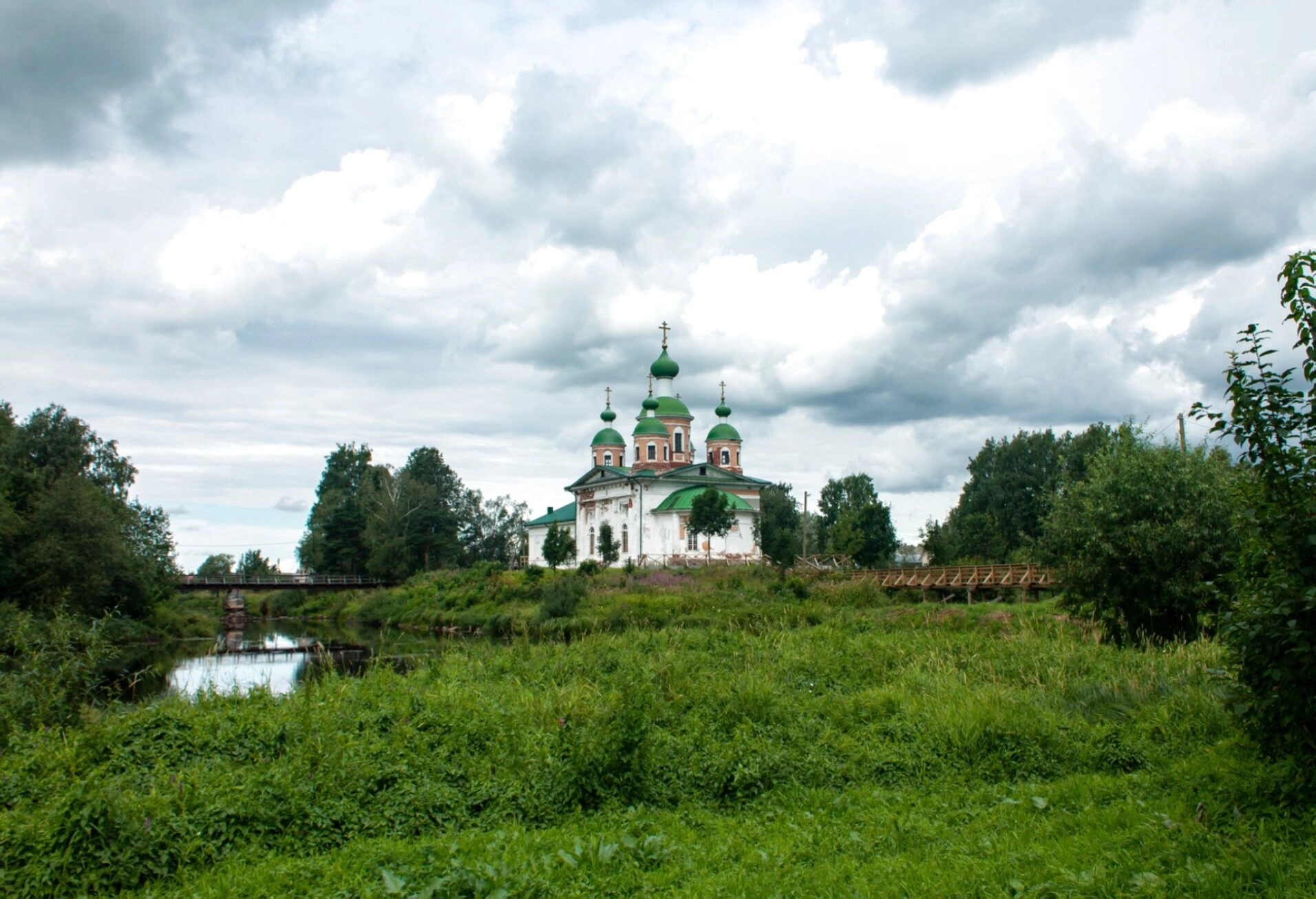Белоснежные стены собора, символизирующие чистоту и святость, гармонично сочетаются с ярко-зелёными куполами, увенчанными златоглавыми крестами, устремлёнными в небо. Пышная зелёная растительность, окружающая церковь, и спокойные воды реки создают ощущение мира, покоя и единения с природой. Небесная гладь с облаками добавляет величия всему образу.