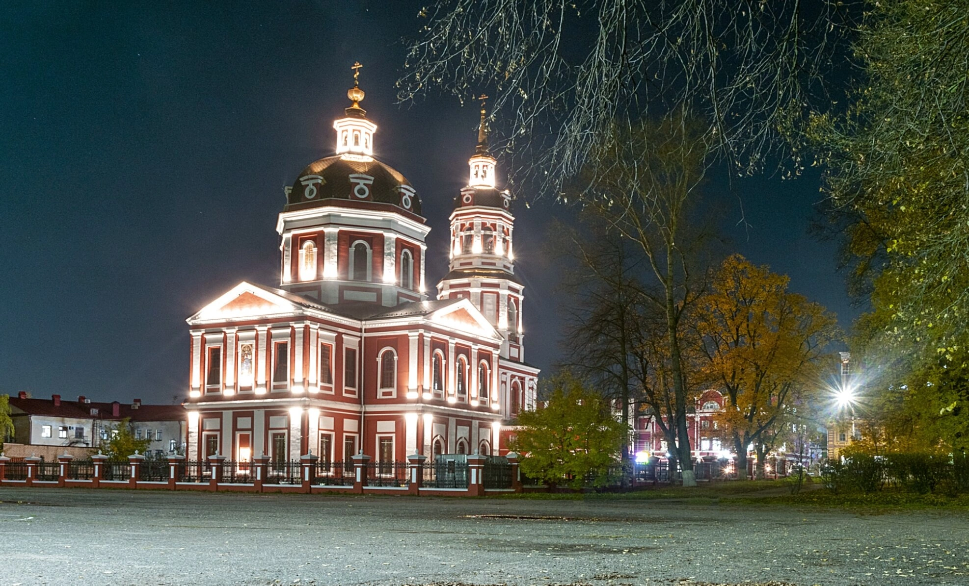 На представленной фотографии запечатлён величественный Спасский собор, также известный как Собор Спаса Нерукотворного Образа, в вечернее время. Его освещённые золотые купола и кресты, устремлённые в небо, создают ощущение благодати и божественного присутствия в самом сердце города Кирова.