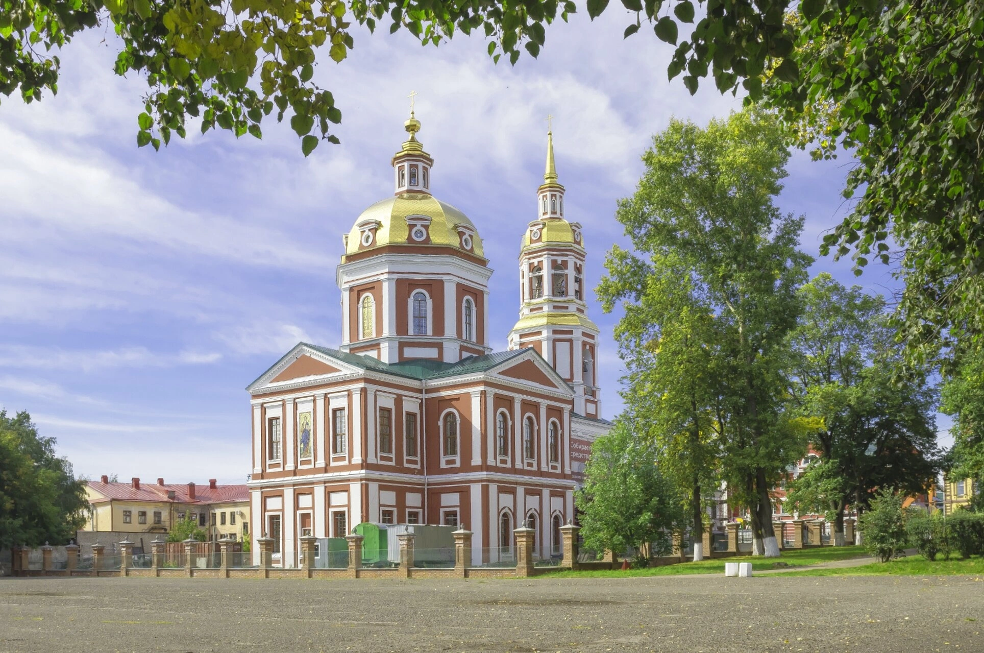 На представленной фотографии запечатлён величественный Спасский собор, находящийся в историческом центре города Кирова. Двухъярусный храм, освящённый в честь Нерукотворного Образа Спасителя, поражает своим благолепием. Алые стены, украшенные белоснежными декоративными элементами и увенчанные сияющими золотыми куполами с крестами, создают яркий и запоминающийся образ.