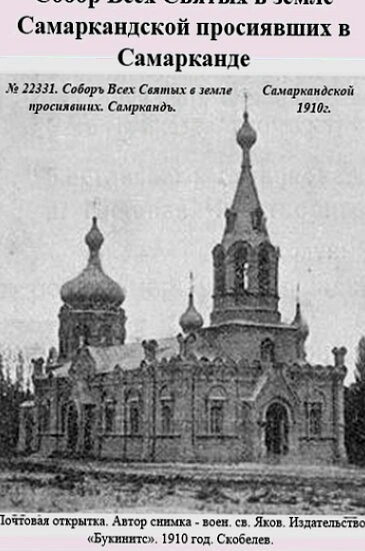На представленной старинной фотографии запечатлен Собор Святителя Алексия Московского в Самарканде. Снимок был сделан в 1910 году и впоследствии издан в виде почтовой открытки издательством «Букинитс». Надпись на оригинальной открытке гласит: «Собор Всех Святых в земле Самаркандской просиявших в Самарканде» с номером 22331.