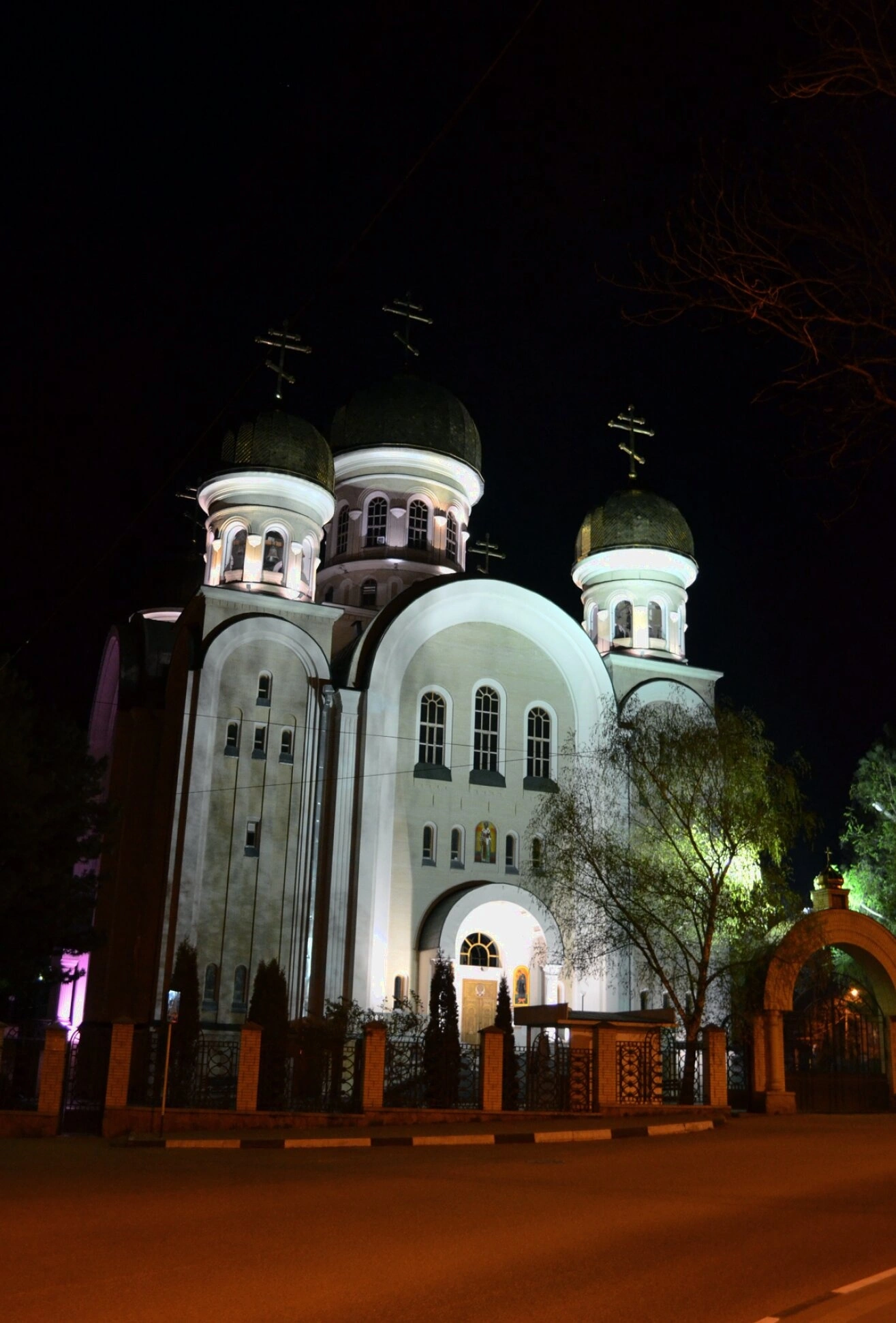 На представленной фотографии запечатлён величественный Собор Святителя Николая Чудотворца, главный православный храм города-курорта Кисловодска. Снимок сделан в тёмное время суток, когда искусная подсветка эффектно выделяет светлые стены храма и сияние его золоченых глав на фоне тёмного неба, создавая атмосферу благоговения и духовного трепета.