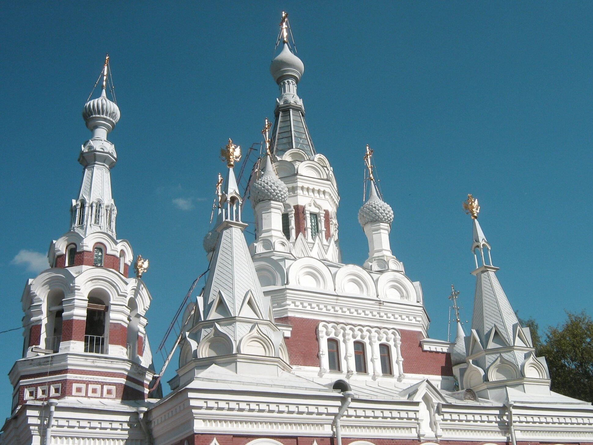 На представленной фотографии люди не запечатлены. В объектив попал сам архитектурный ансамбль во всей его величественной строгости и благолепии. В спокойной цветовой гамме выделяются белые детали декора на фоне тёплого красного кирпича, устремлённые ввысь золотые кресты и лазурное небо, символизирующее небесную чистоту. Снимок позволяет вдумчиво рассмотреть и оценить каждую деталь священного сооружения, созданного как монумент вере, царю и отечеству.