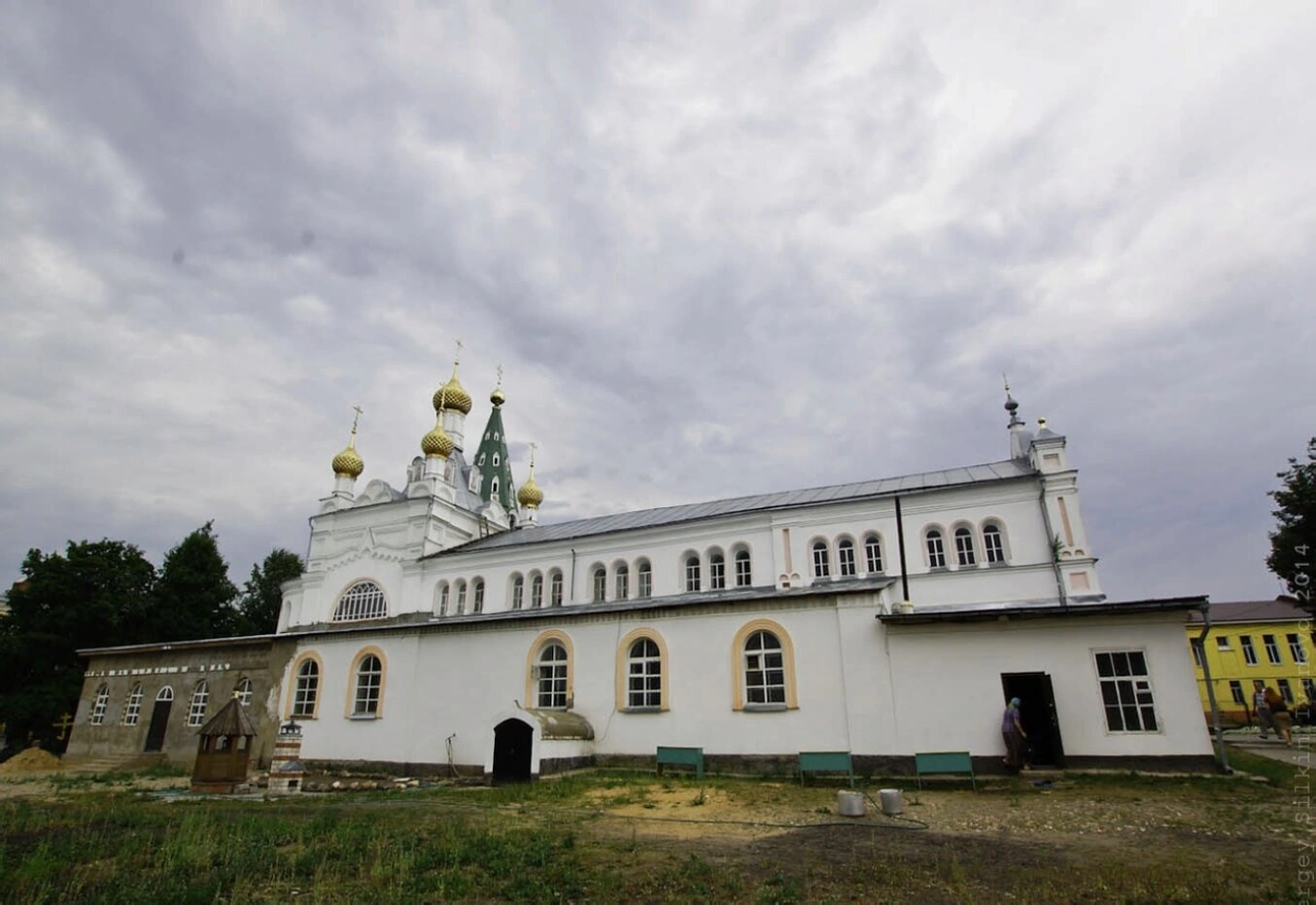 С западной стороны к основному объёму храма примыкает трапезная часть, что является характерным элементом композиции многих русских церквей. На момент съёмки территория вокруг собора выглядит неблагоустроенной, что, однако, не умаляет его величия и не скрывает благодатной красоты, присущей этому святому месту. На заднем плане виднеется пасмурное небо, что придаёт кадру особую, сокровенную атмосферу.