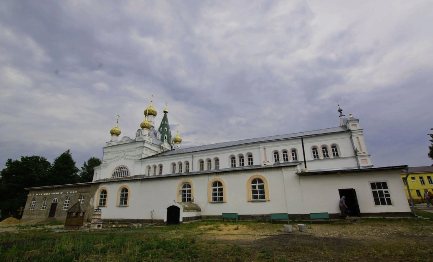 Чёткие линии и симметричные формы собора, украшенные арочными оконными проёмами, создают ощущение монументальности и духовной твёрдости. Зелёные кровли и золотые кресты, вознесённые к небу, символизируют надежду и вечную жизнь, напоминая верующим о горнем мире. На переднем плане видна территория, находящаяся в процессе благоустройства, что свидетельствует о продолжающейся заботе о святыне.