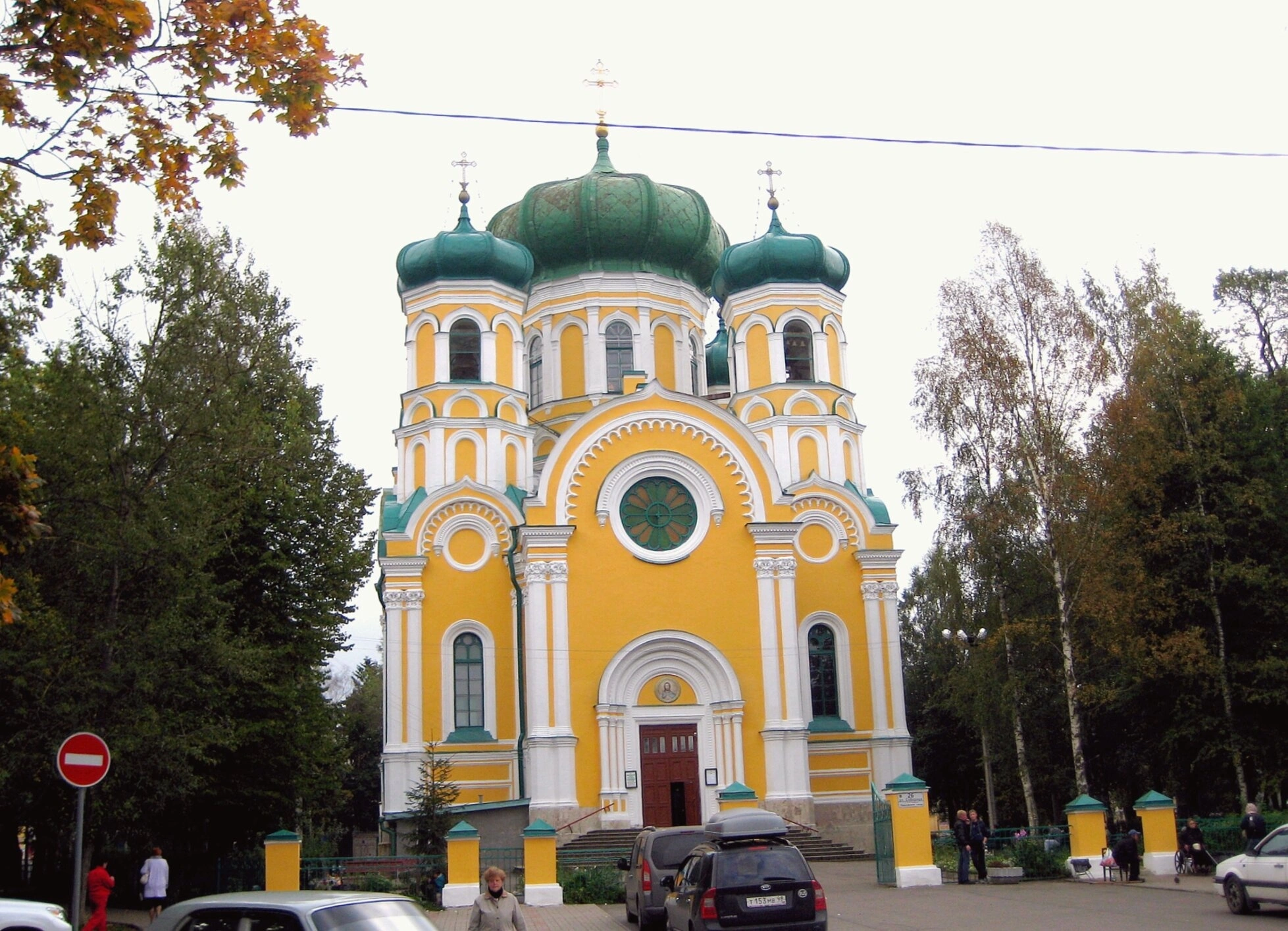 Храм окружает живописный ландшафт с хвойными и лиственными деревьями, чья листва приобрела золотистые осенние оттенки. Перед собором расположена благоустроенная территория с парковкой для прихожан. На переднем плане слева установлен дорожный знак, регулирующий движение транспорта. Собор был освящен в 1852 году и с тех пор является духовным центром православной жизни Гатчины, сохраняя свою архитектурную и историческую ценность для будущих поколений.