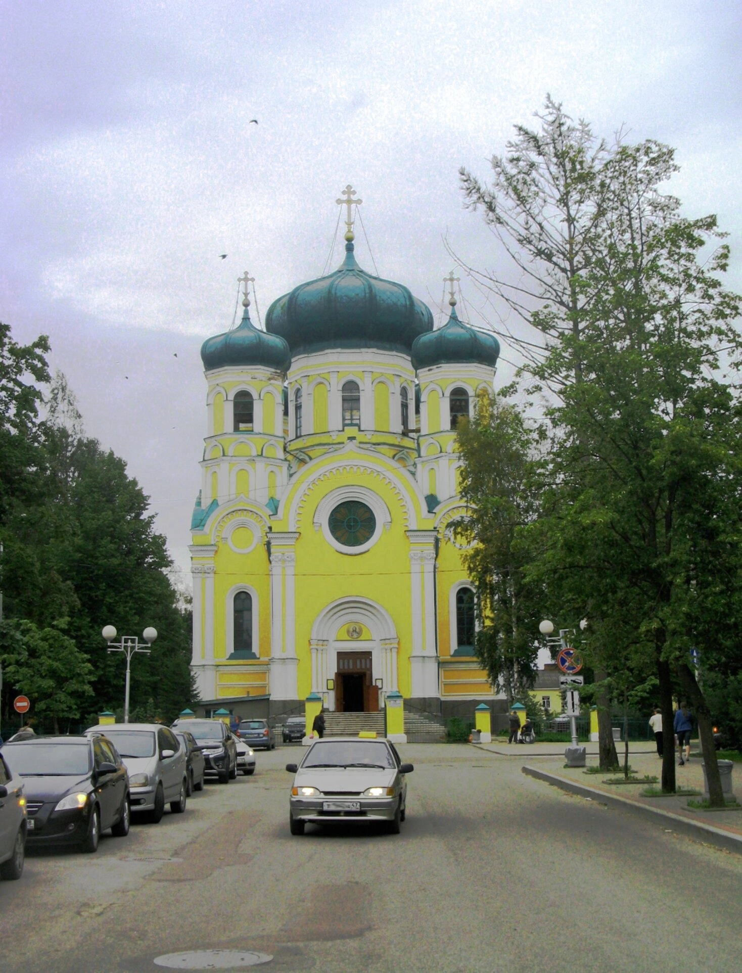 Перед собором простирается благоустроенная территория с аллеей из стройных деревьев, ведущей к святому месту. На фотографии видна Соборная улица с припаркованными автомобилями, что свидетельствует о современном периоде съемки. По обеим сторонам храма пролегают пешеходные дорожки, используемые прихожанами и паломниками для подходов к собору.